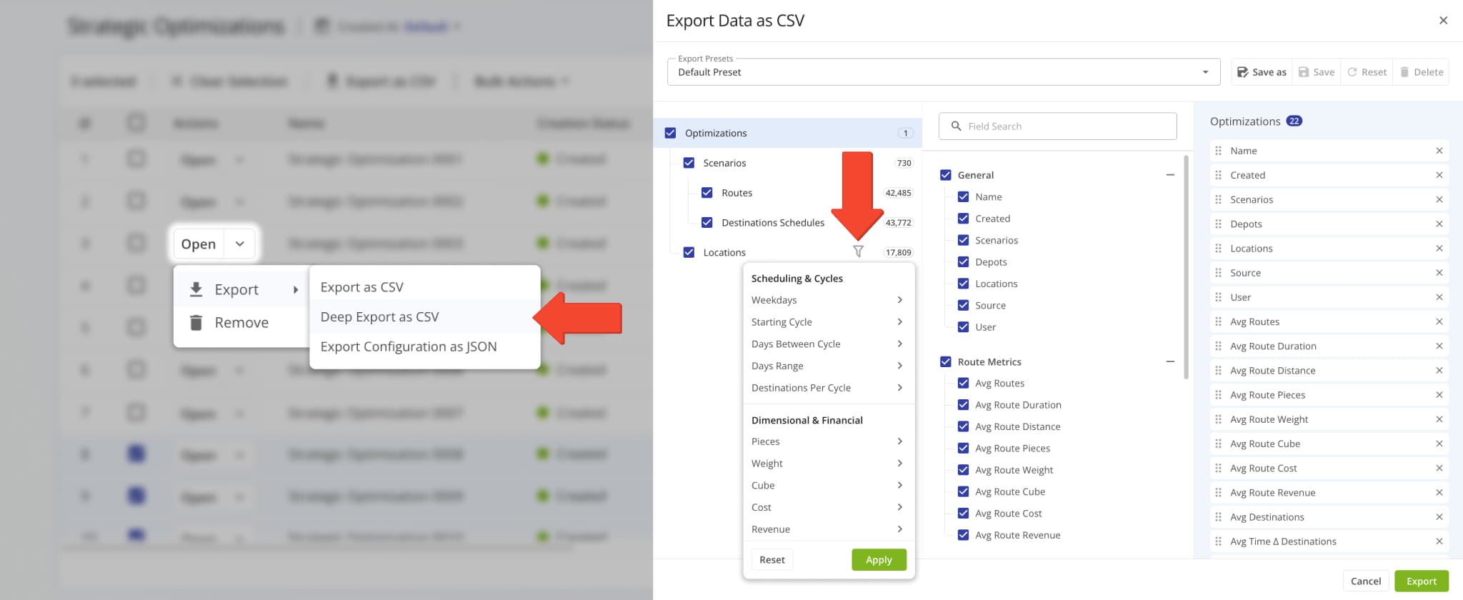 When you manage Strategic Optimizations and Strategic Scenarios, you have access to in-depth export customization through the “Deep Export” option. This update introduces dynamic filter options for optimization and scenario deep export. Additionally, new counters next to the Filter Button help you see exactly how many data items are available according to your settings.