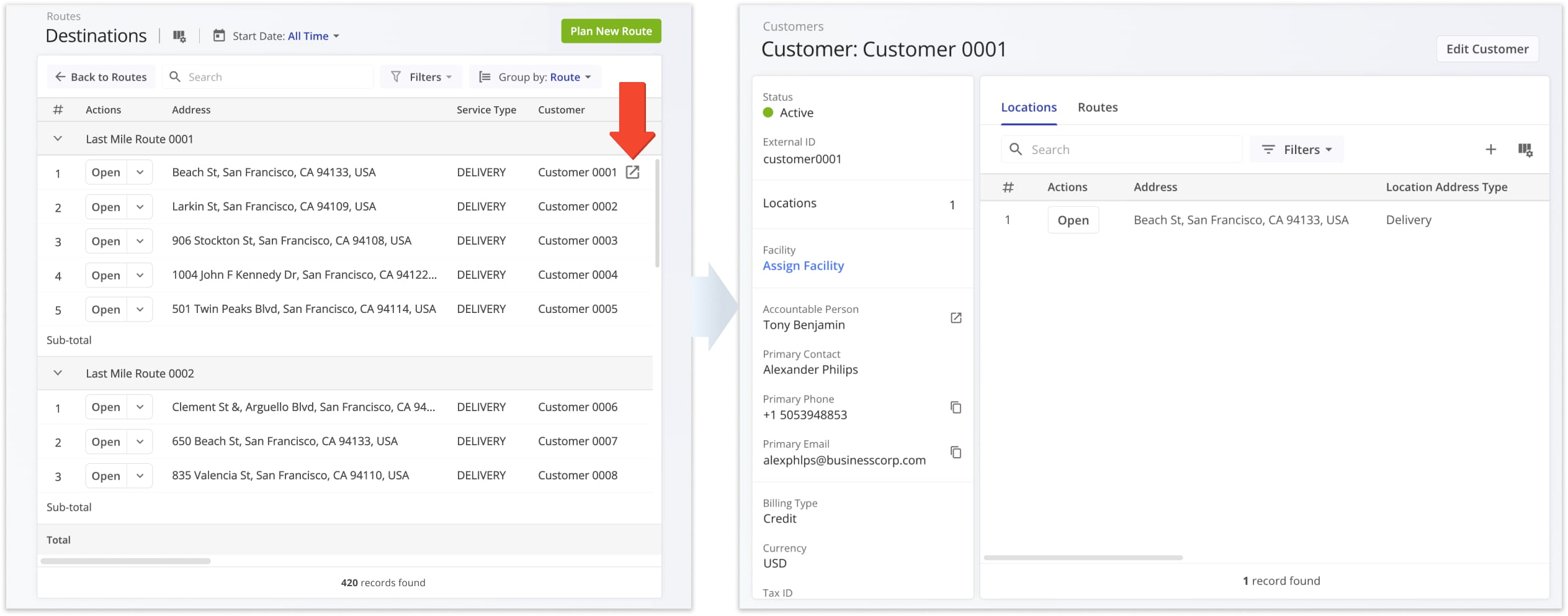 The Destinations Page “Customer” column was updated with new dynamic functionality. When you hover over a Customer, you’ll see a new button. You can click the new Open Button, to go directly to the corresponding Customer Snapshot.
