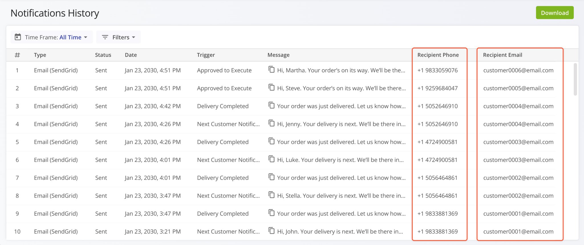 The “Recipient Phone” and “Recipient Email” columns were added to the Notifications History page. They show a contact person’s phone number and email address, respectively. This enables you to easily find the contact details associated with any of your customer notifications. Previously, only the timestamp, trigger, and message text were available.