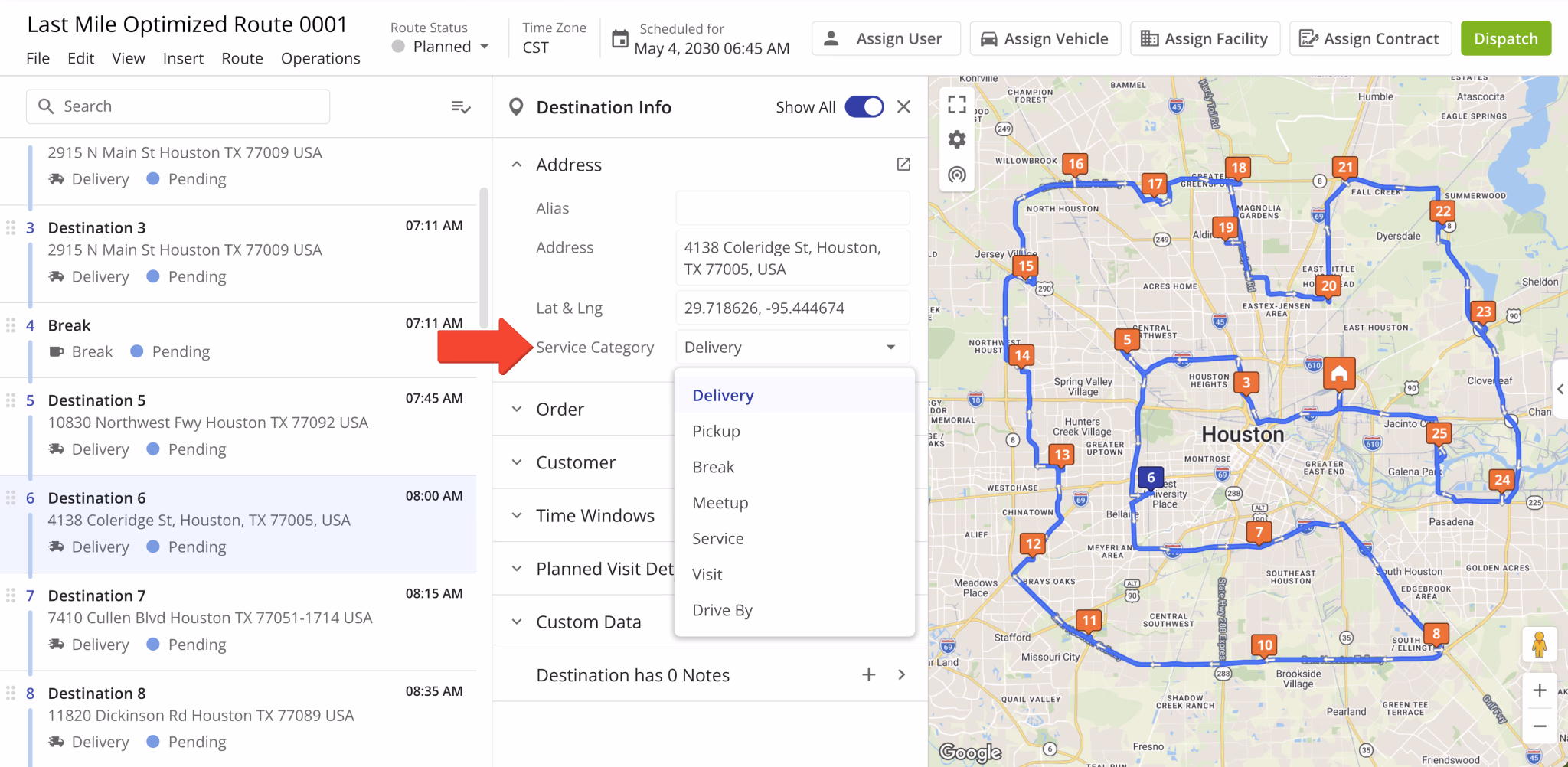 Assign Vehicle: Assign a vehicle to the route from your homogeneous or mixed fleet of vehicles.