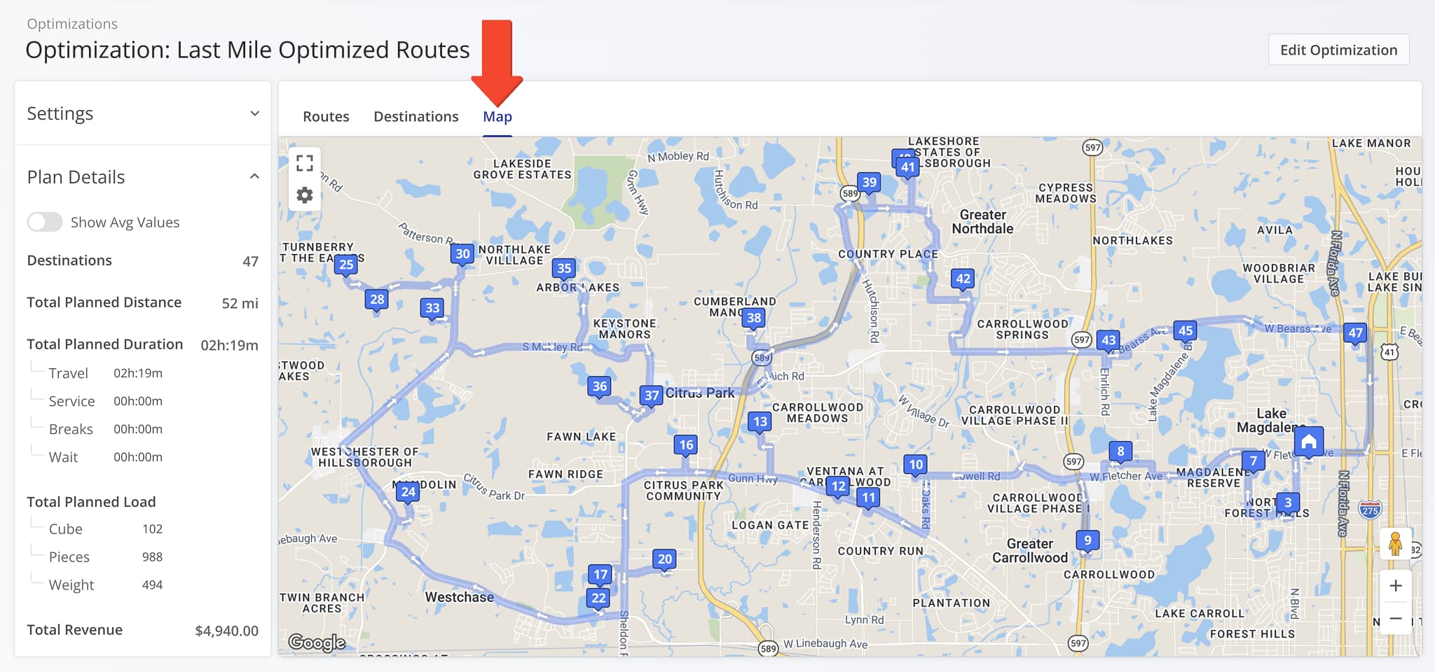 A new “Map” section was added to Optimization Snapshots showing route destinations and directions.