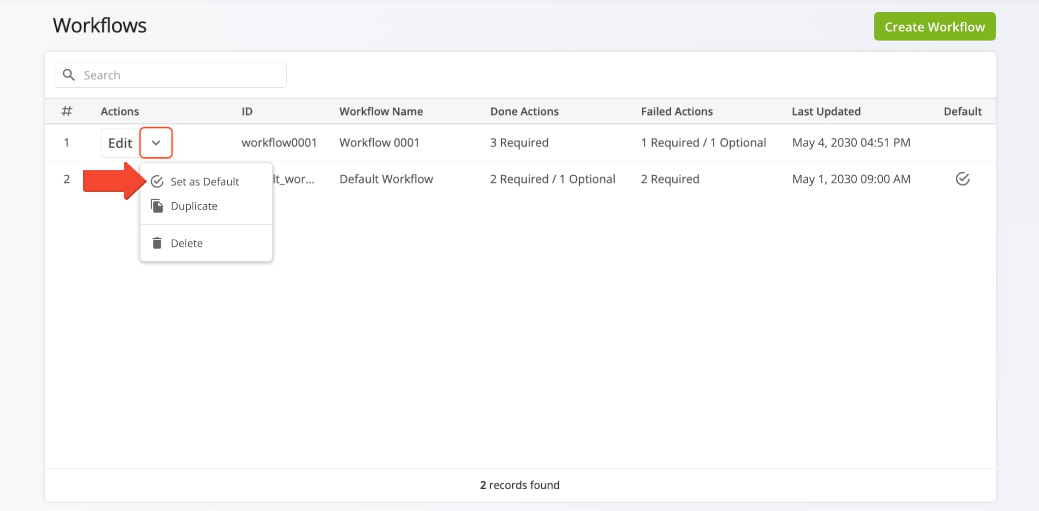 A new “Set as Default” option was added when you open the management actions by clicking the Down Arrow next to a Workflow. Selecting the new option will set the Workflow as the default when planning new routes.