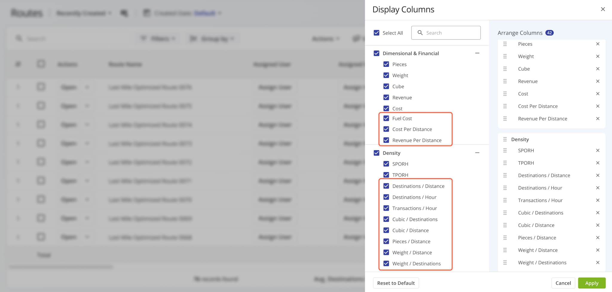 The Route Metrics interface on the Routes Page was updated with new data fields. After you open the Route Metrics, click the Gear Icon to customize the data fields shown in the metrics panel.