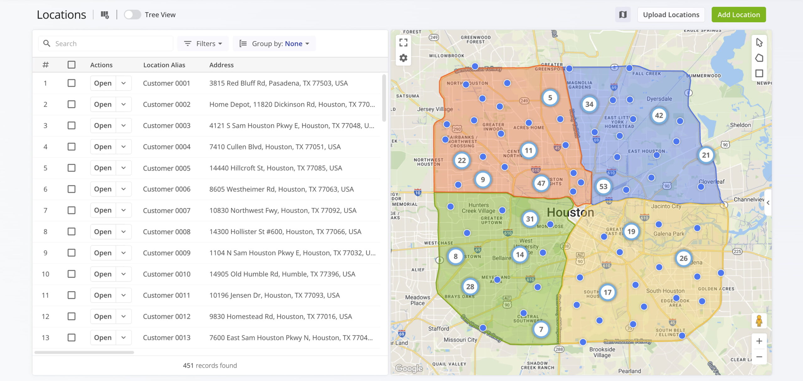 The Customer Locations page lets you store and manage large volumes of customer addresses, with map-based visualization and route optimization features.