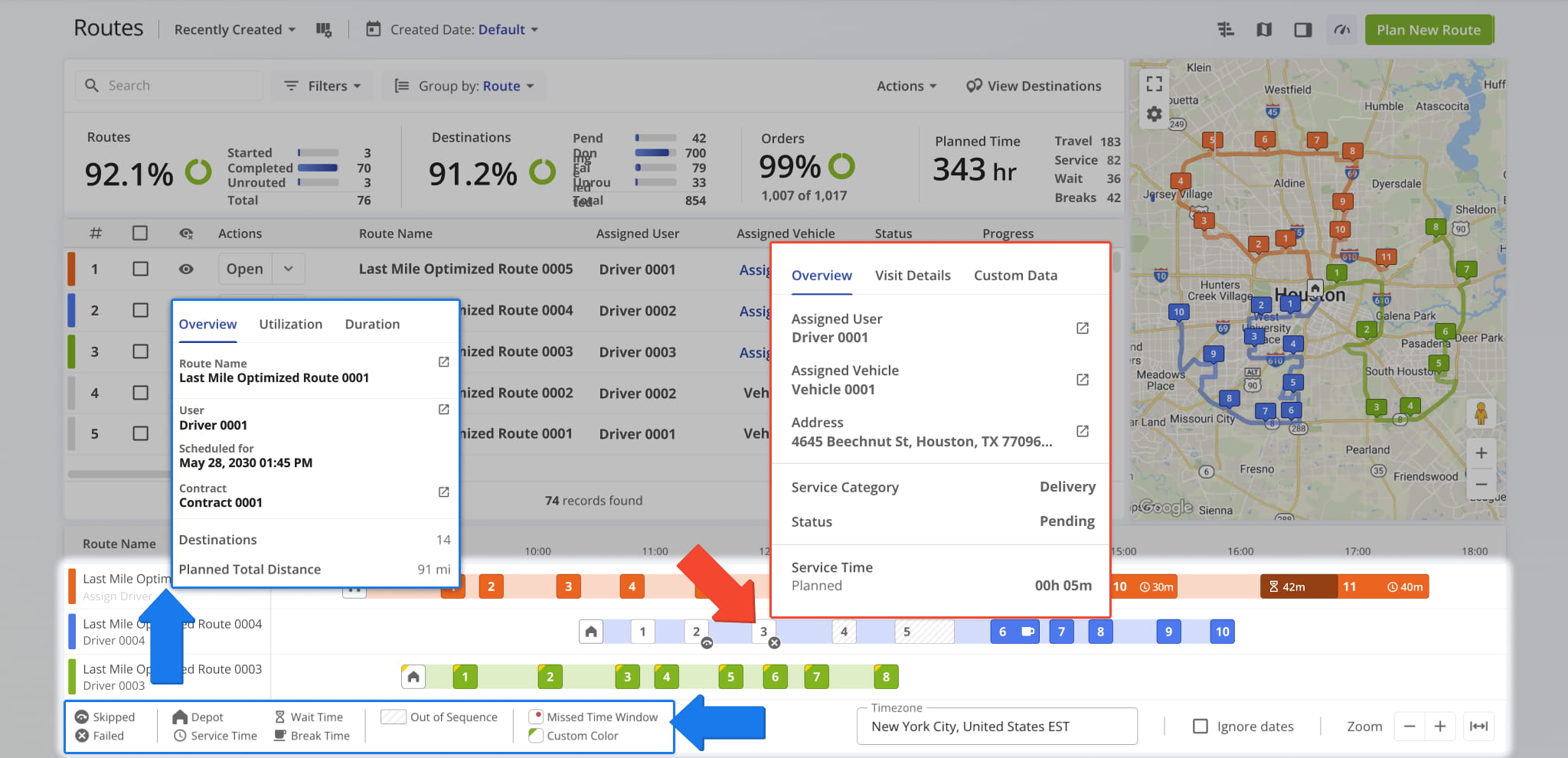 The Routes page now includes an Interactive Route Timeline. You can view scheduled routes side by side, check destination service times, wait times, missed time windows, out of sequence visits, order details, and more.