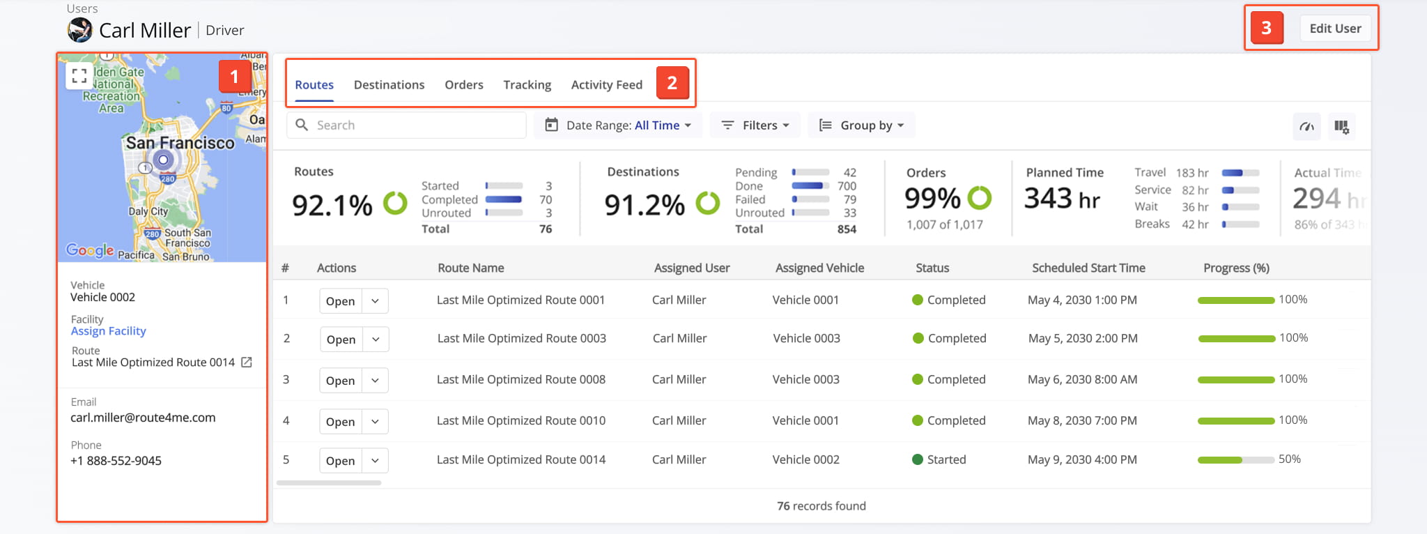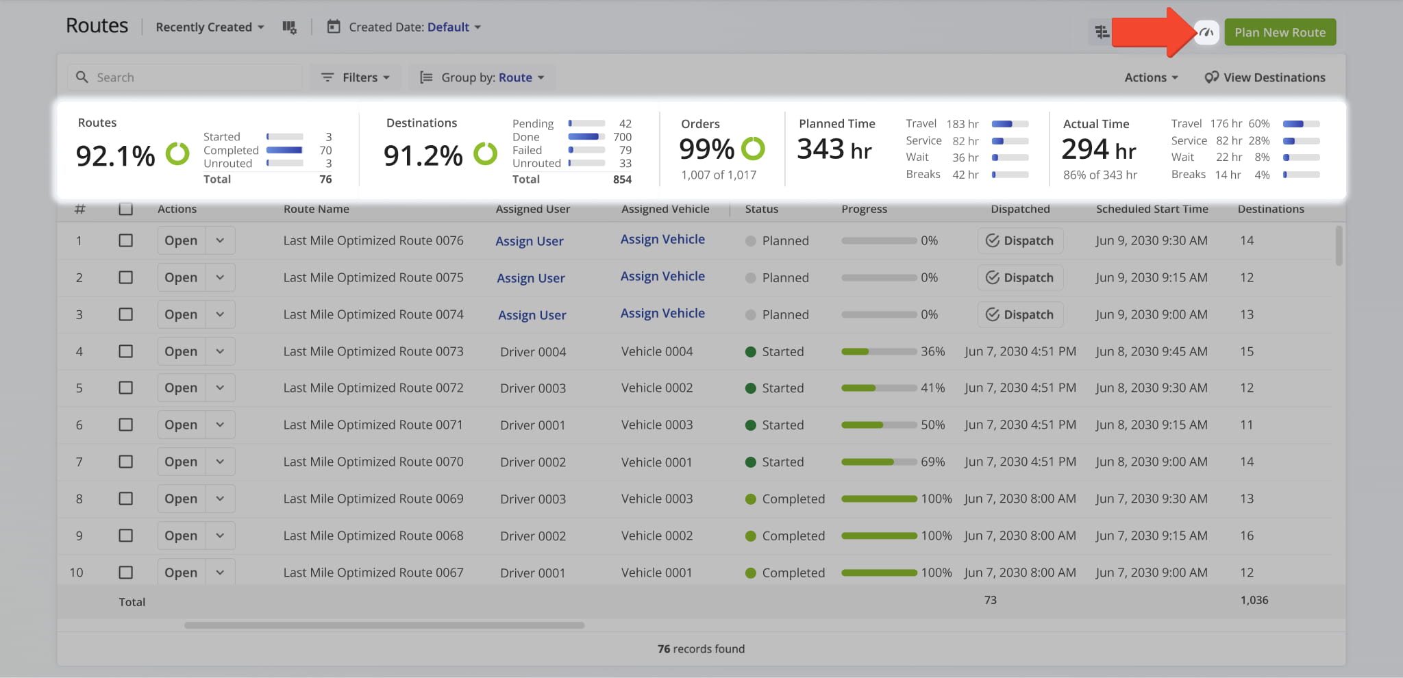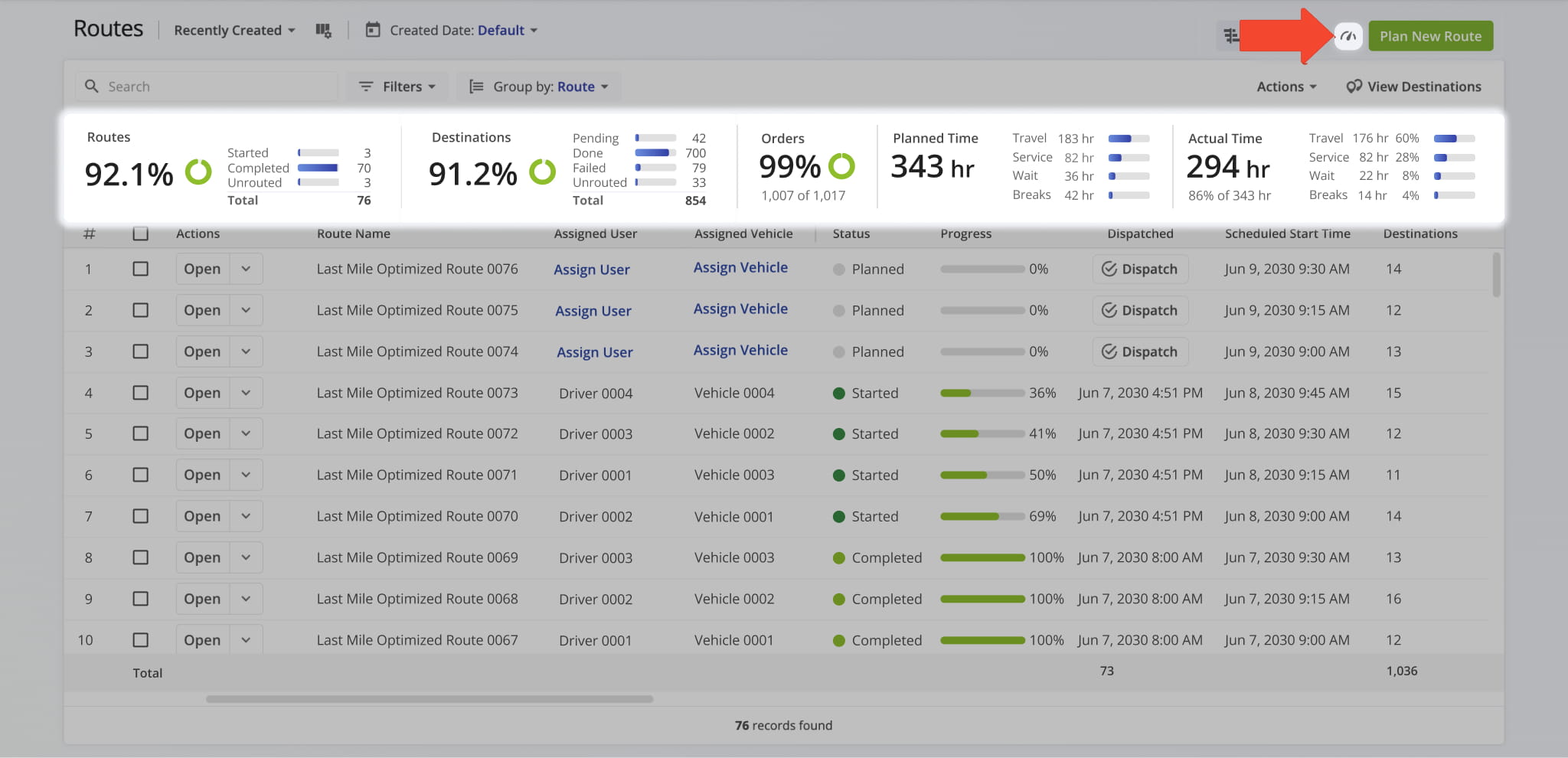 The new Route Metrics Dashboard on the Routes page provides a centralized view of route performance, including order and route completion, visitations, planned vs. actual metrics, and worked hours.