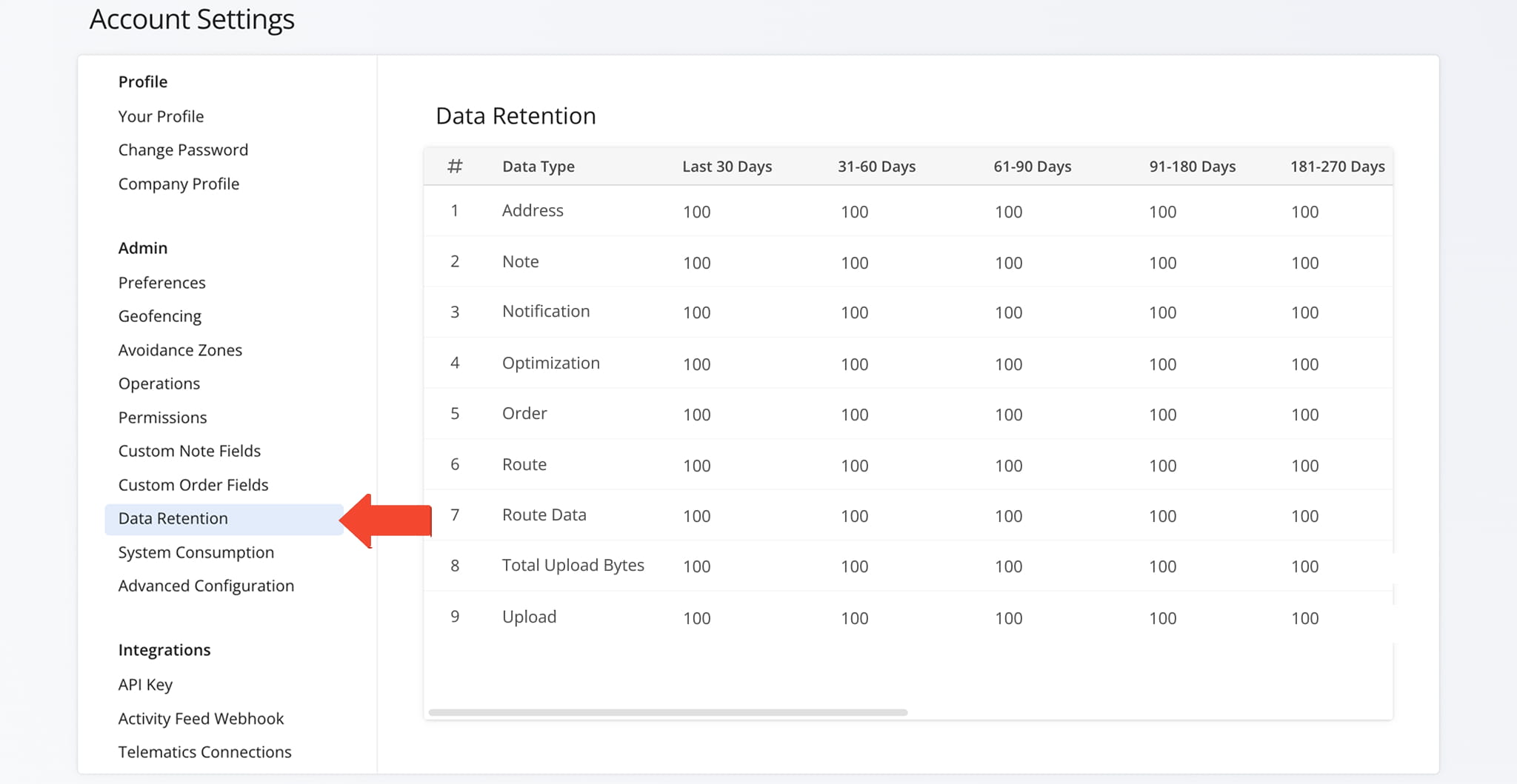 The Data Retention tab in Account Settings shows your current retention metrics, organized by activity and entity type.
