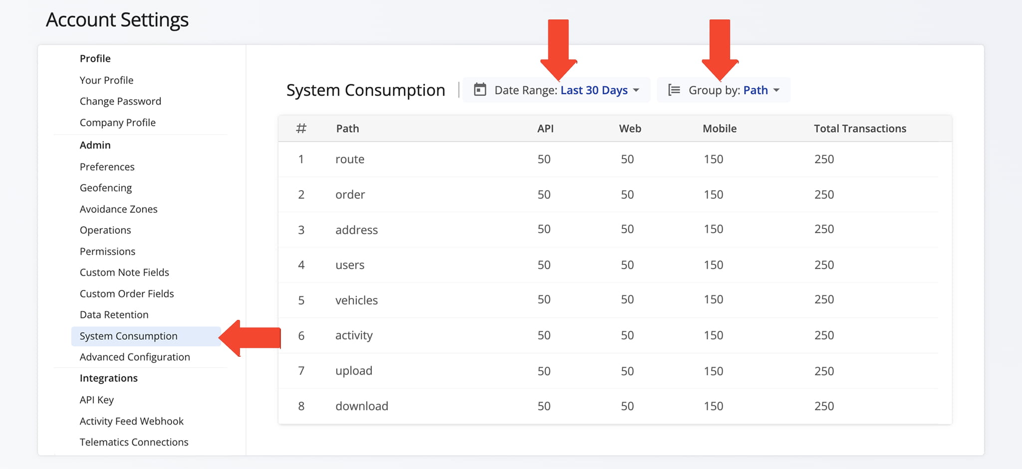 The System Consumption page in Account Settings shows your current usage metrics and the number of completed requests for each activity type.