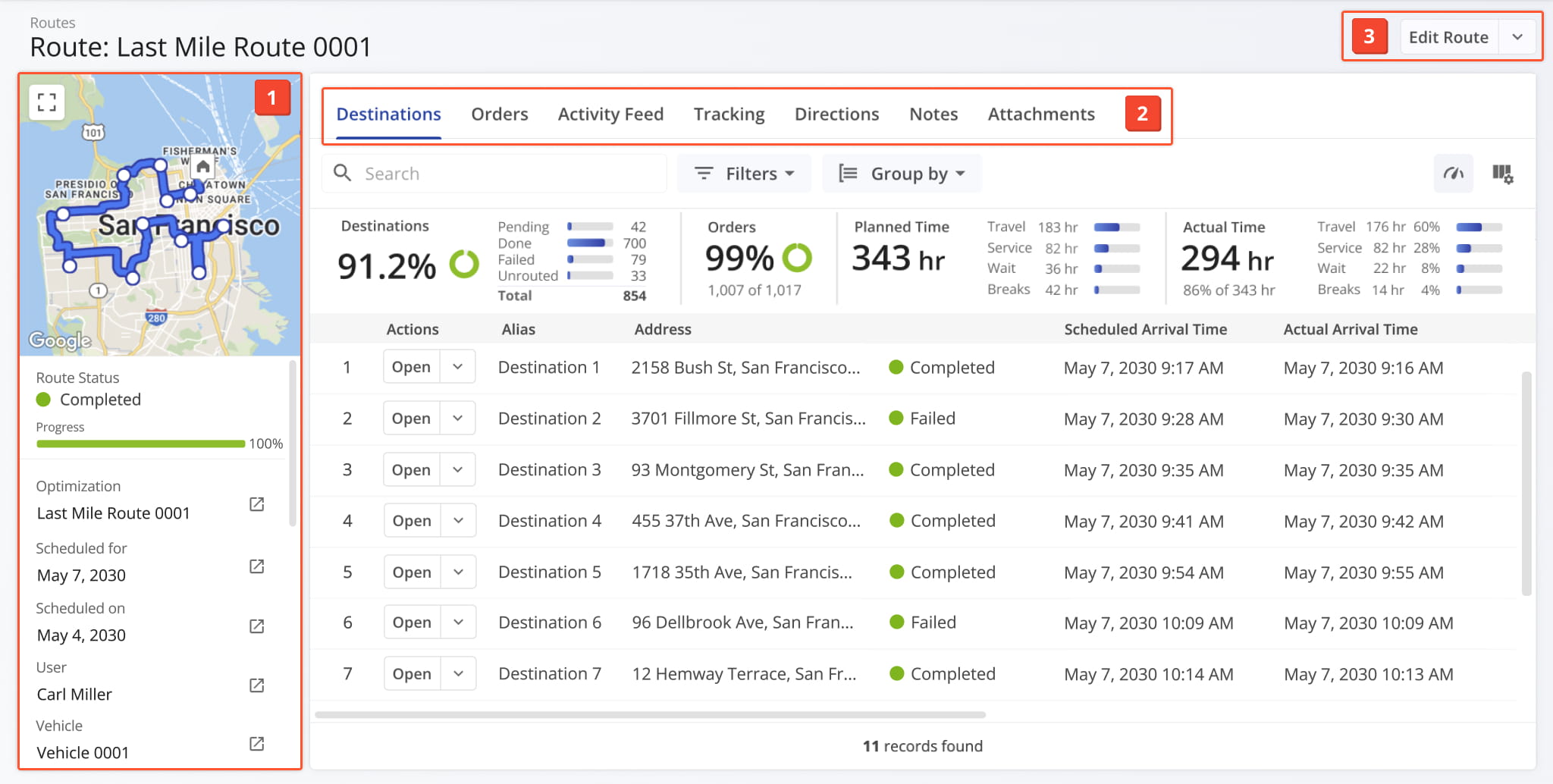 11The Route Snapshot provides a centralized summary of each route, including a map overview and key analytics for destinations, orders, proof of visit, and other activities.