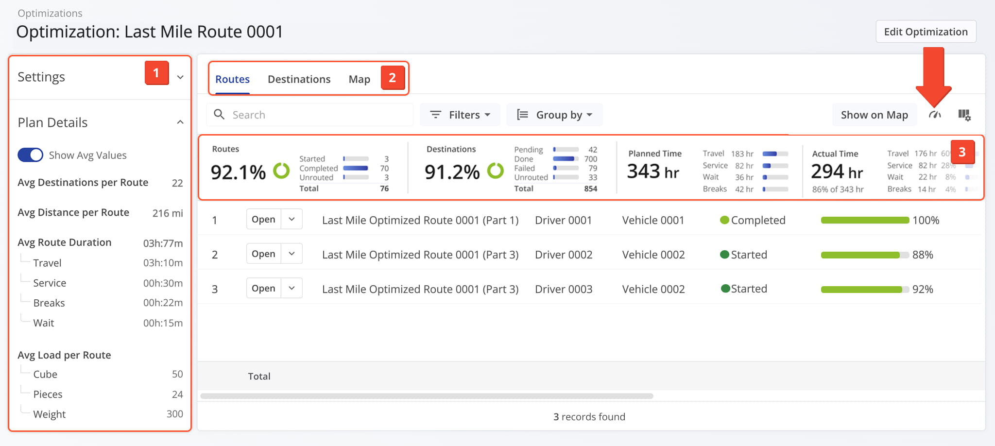 4The Routes page now includes a Route Metrics Summary Dashboard for enhanced performance tracking in real time. Easily filter routes and view key metrics to compare planned vs. actual performance, destinations, orders, labor hours, and more.