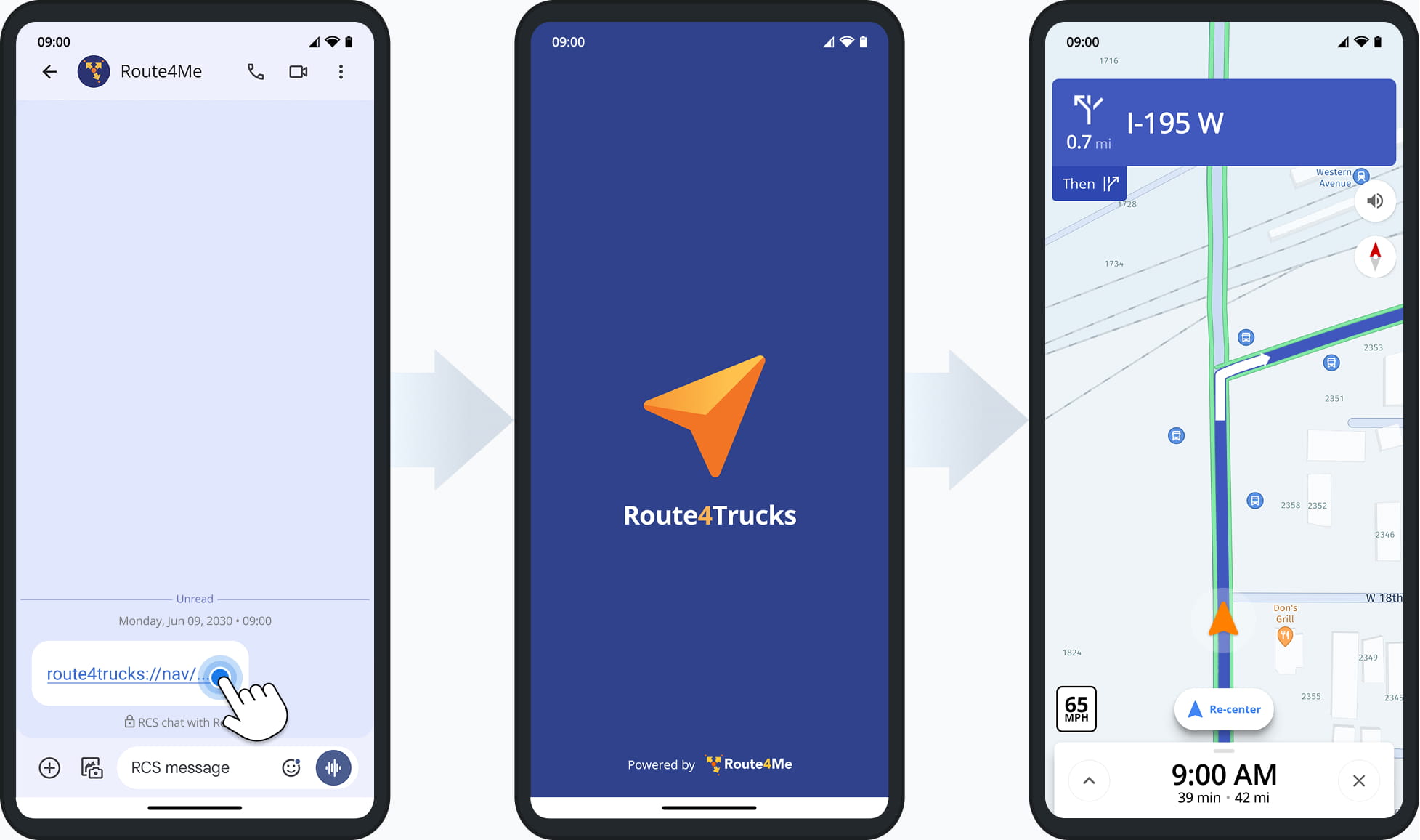 8Create a custom Deep Link (URL) containing route and commercial vehicle parameters for a specific destination, then send it to a driver via SMS, email, or other channels. When opened, the Route4Trucks GPS app launches automatically, navigates to the destination, and generates directions based on the vehicle parameters.