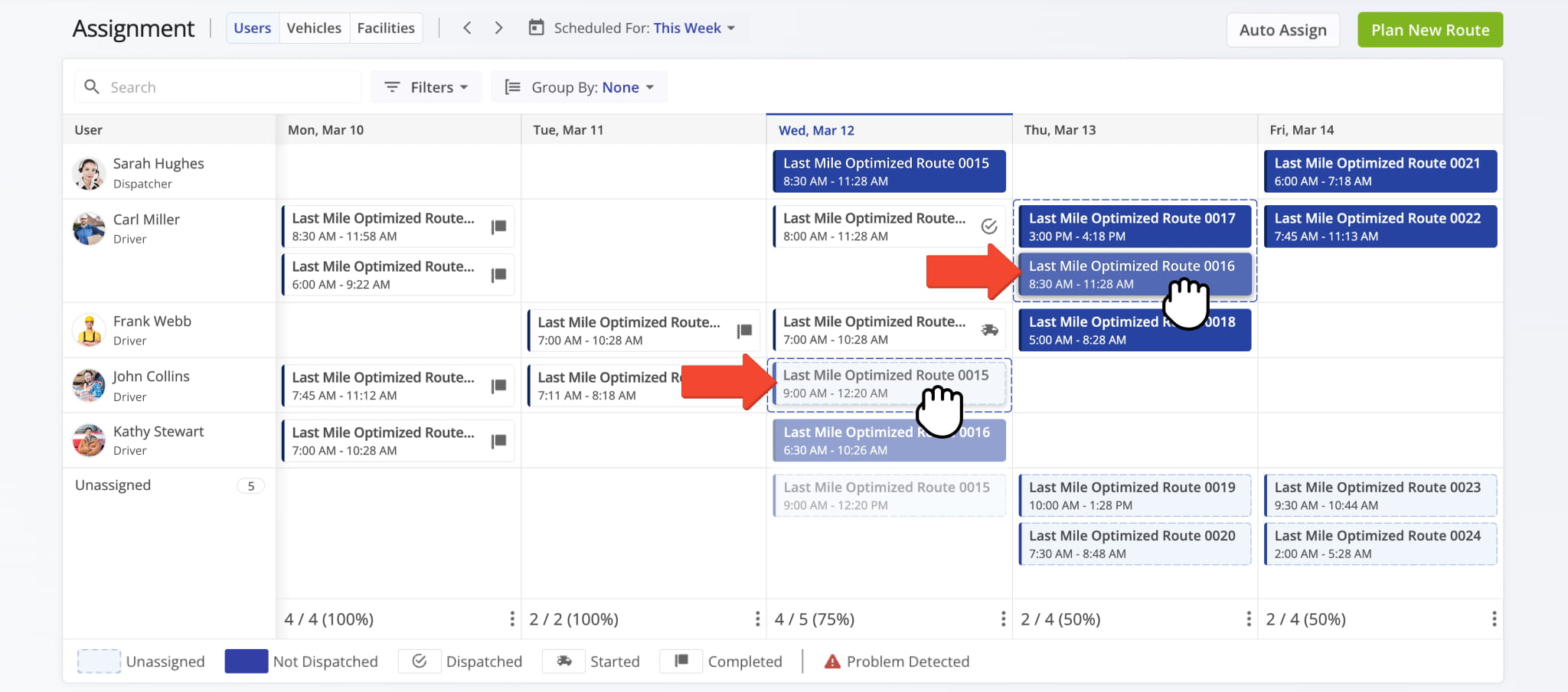 1The Assignment Dashboard provides a calendar overview of scheduled routes and streamlines dispatch by letting you drag and drop drivers, team members, and vehicles onto routes.