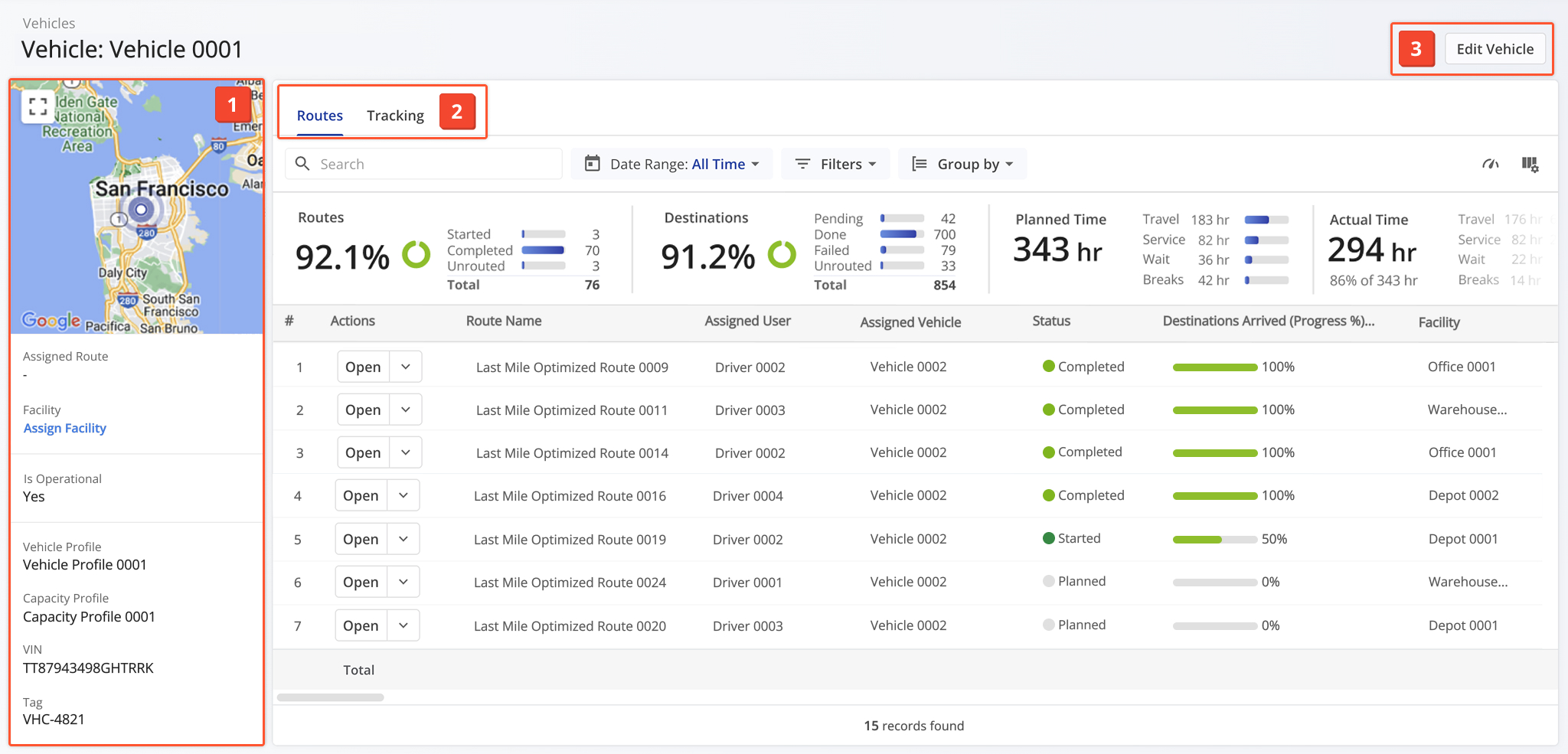 The Vehicle Snapshot provides a centralized summary of each vehicle, including key analytics for its associated routes.