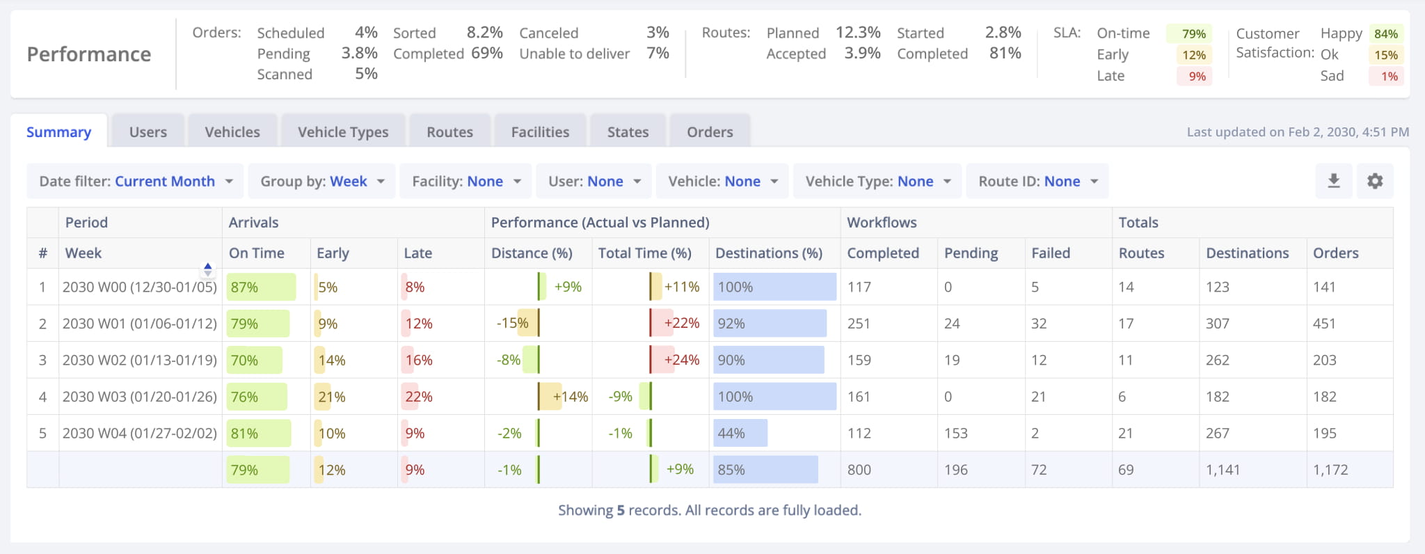 The Business Insights dashboard provides actionable performance metrics across your organization, with reports that can be easily filtered and grouped by users, vehicles, orders, routes, and other parameters.