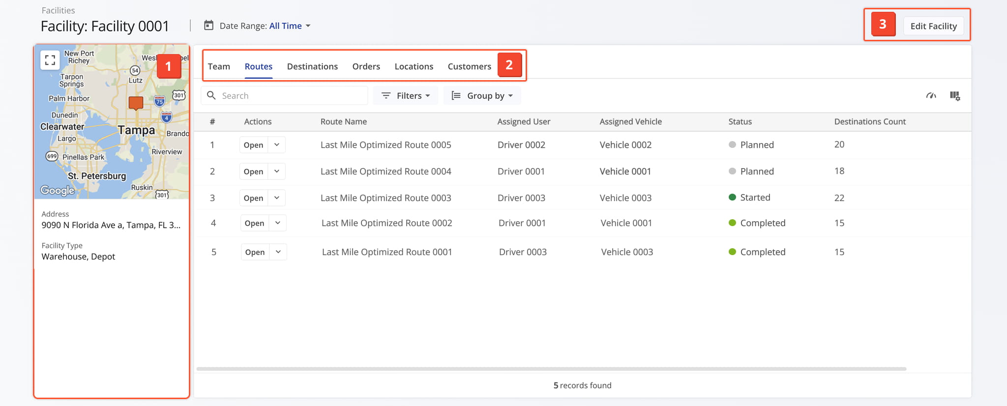 Facilities now includes advanced route, user, and vehicle attribution, making it easier to associate assets with facilities and gain deeper operational insights.