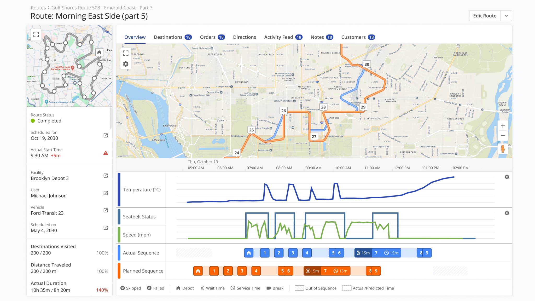The Route Snapshot experience is being expanded with a new visual analytics layer that provides deeper insight into route execution. The updated overview introduces new dynamic graphs and a detailed interactive map, allowing users to analyze performance metrics such as speed, service time, and route progression in a more intuitive and structured way.