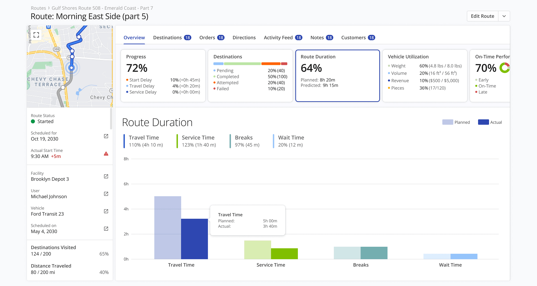 Graphs are grouped into categories, enabling you to visualize key metrics such as route duration distribution, vehicle utilization, on-time performance, route sequence compliance, and more, all tailored to your specific operational needs.