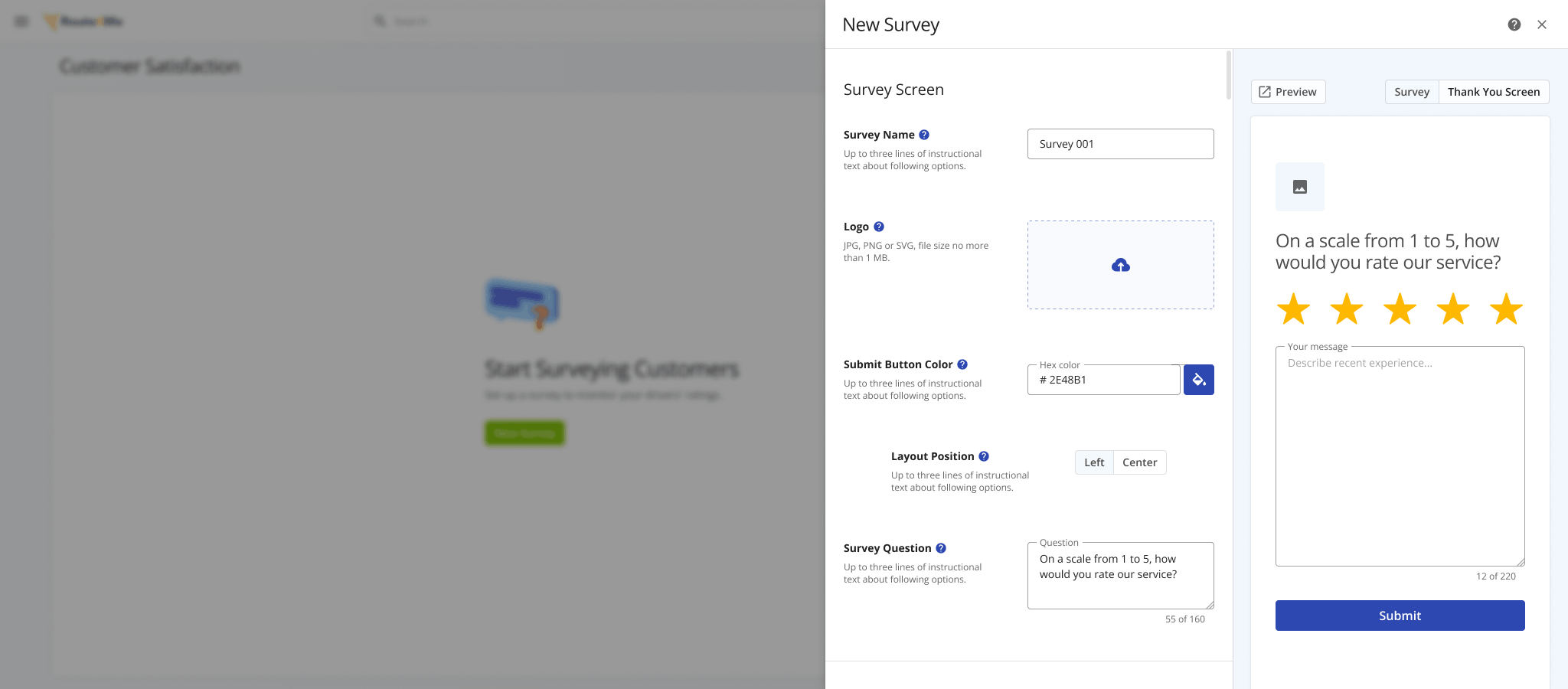 The Customer Satisfaction dashboard is being redesigned to provide a more flexible and intuitive way to create and customize surveys. The updated configuration interface offers improved control over survey questions, branding elements, and response formats, making it easier to tailor feedback collection to specific operational needs.