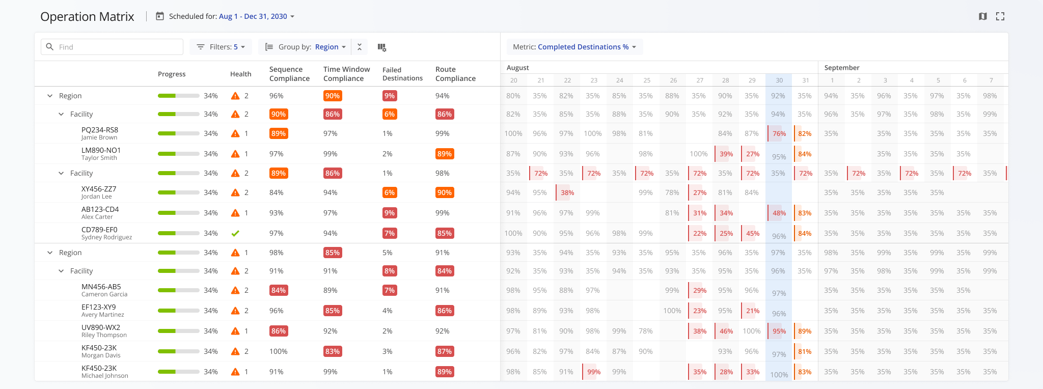 A new Operation Matrix is being introduced to provide a centralized, data-driven view of operational performance across regions, facilities, and routes. It combines key metrics such as progress, compliance, and successful and failed destinations with time-based visualization, enabling users to quickly identify patterns, issues, and trends.