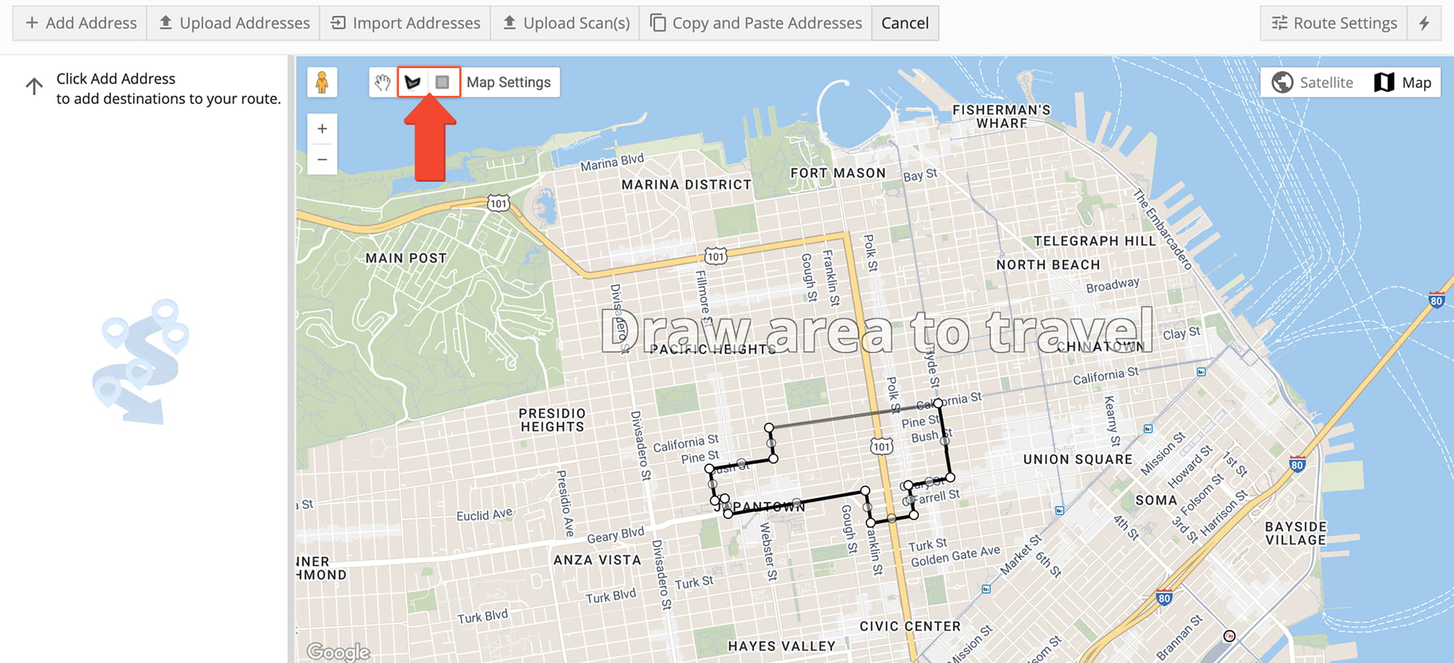 Alternatively, click the free form pentagon to create a custom shape. To define the shape, click anywhere to establish a point on the map and continue drawing the area point by point. Be sure to connect the first and last points to close the shape.