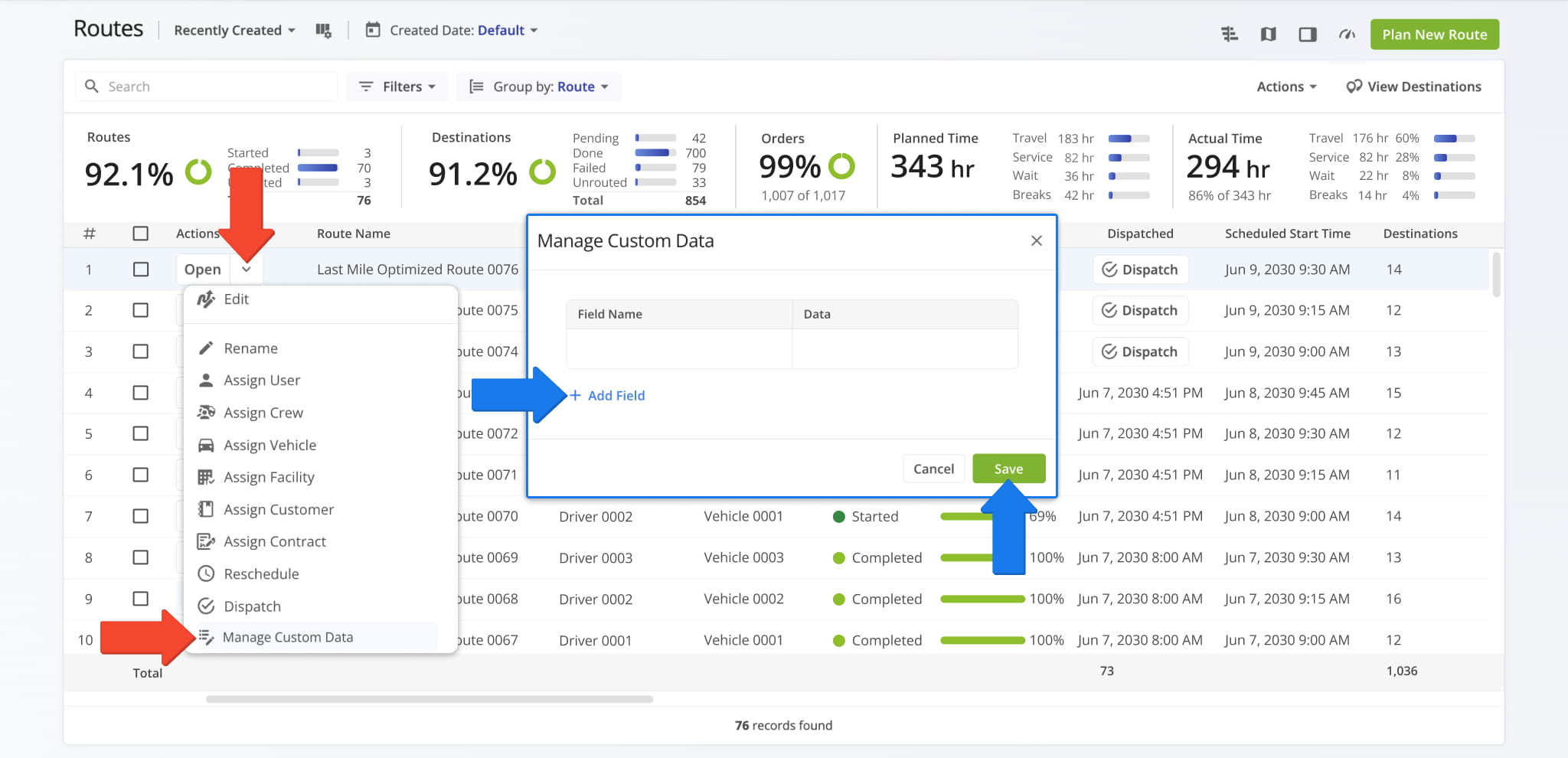 Route4Me’s Custom Data management feature allows you to attach additional, user-defined information to your routes. This feature is available for ether a single route or multiple routes.