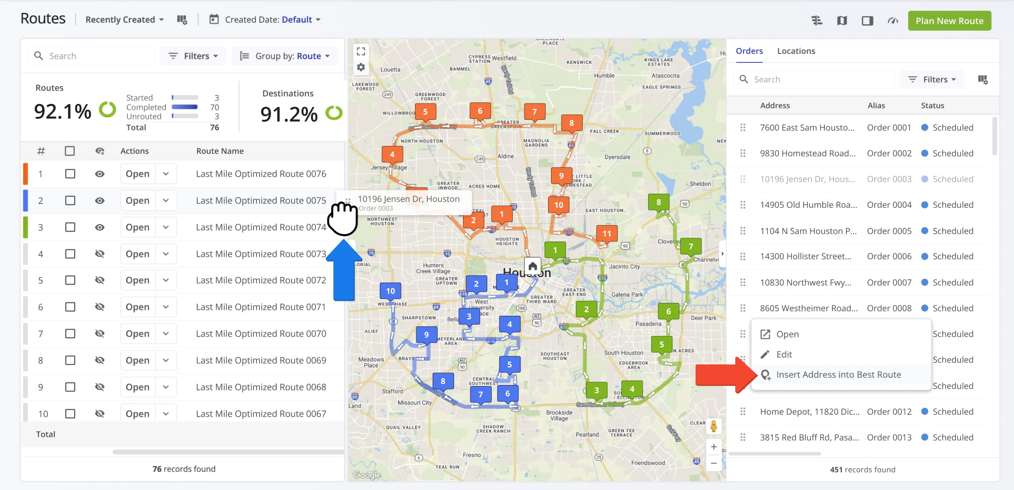 New destinations can be assigned to the most efficient routes to maintain balanced workloads and on-time performance when priorities change. See our dedicated guides to learn more about inserting Orders and Locations.