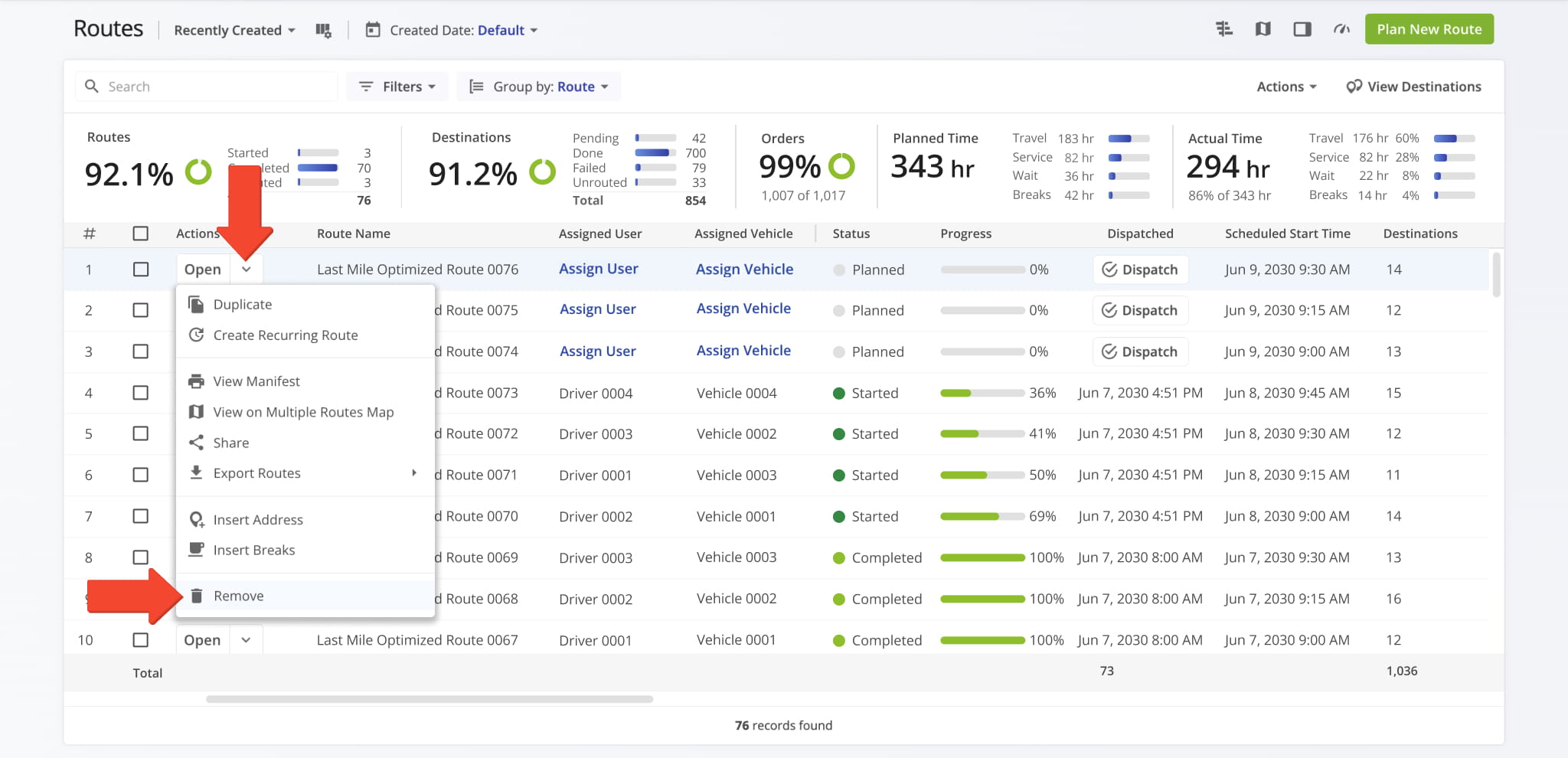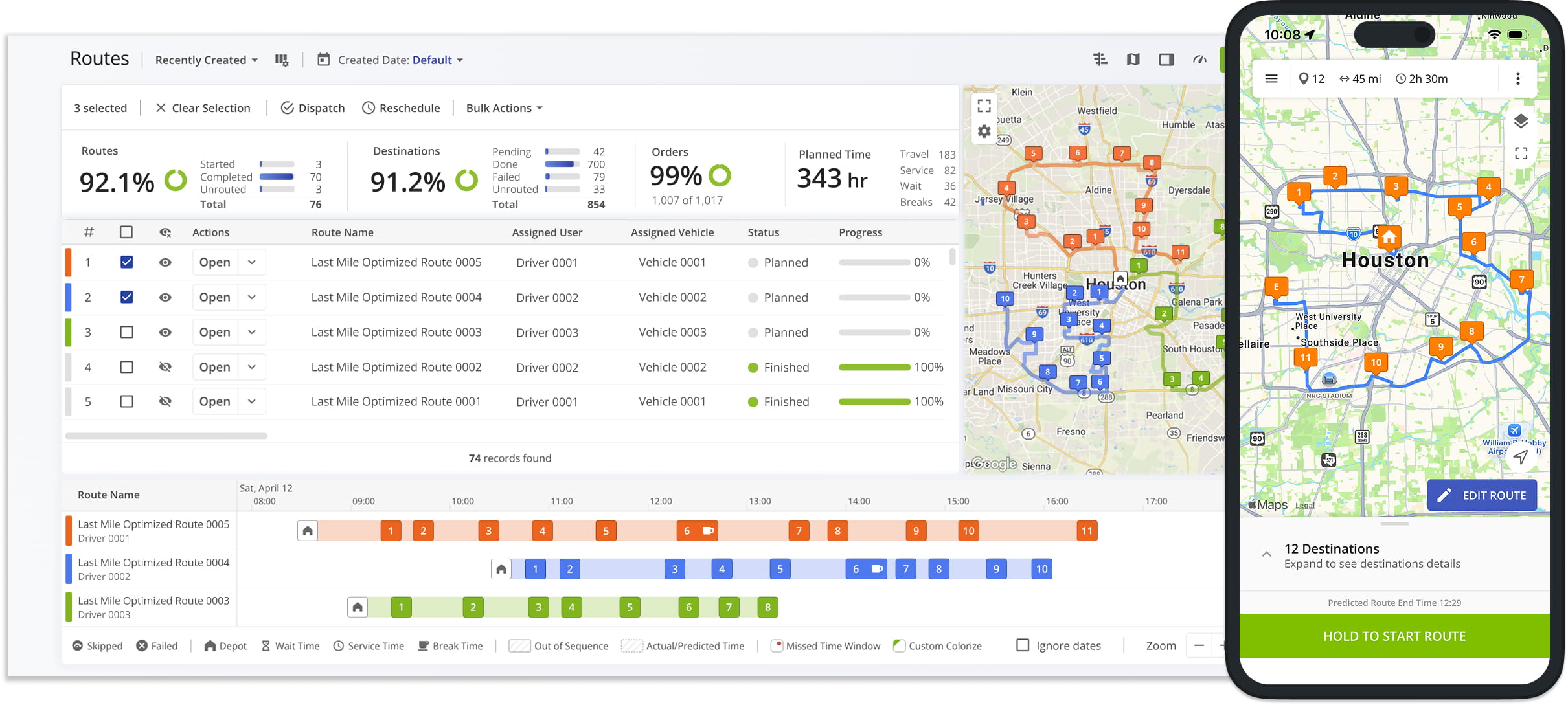 Route4Me supports bulk route management. You can update, re-optimize, duplicate, assign resources, or remove multiple routes simultaneously, among other actions, while maintaining consistency across large route networks.