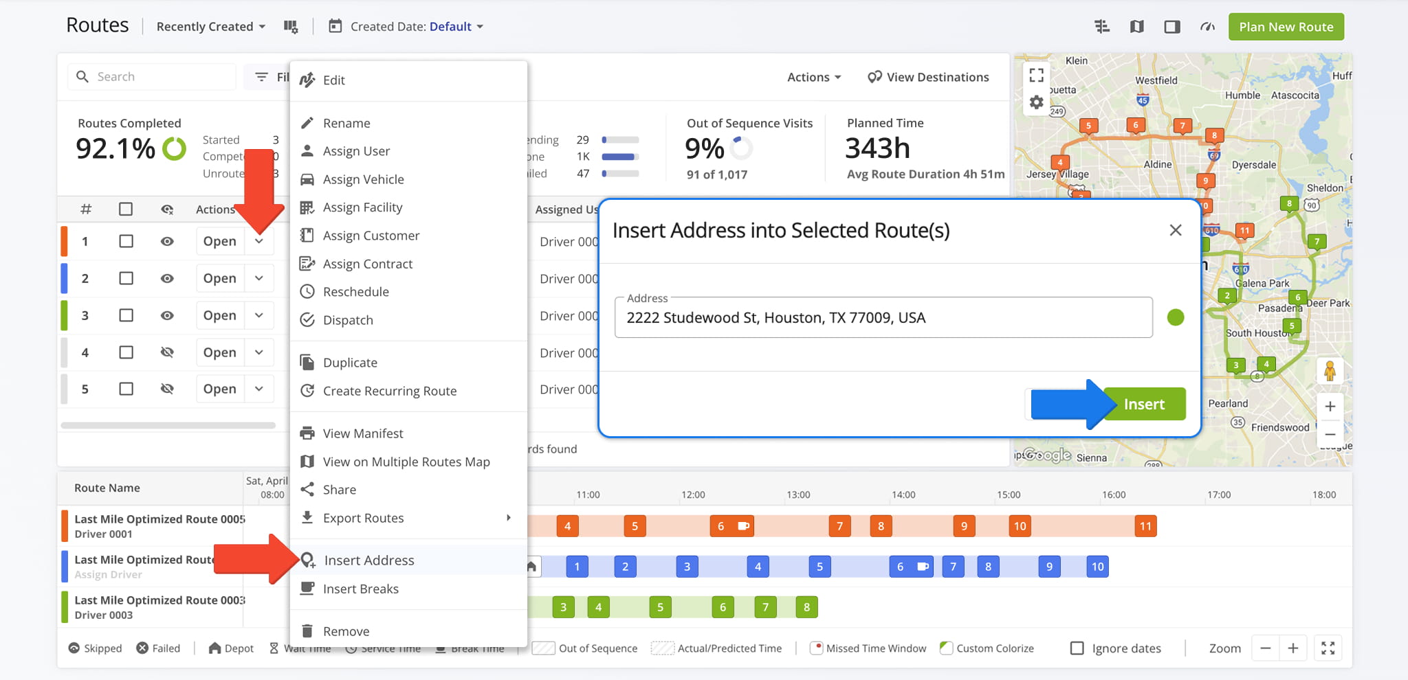 Route4Me enables planners to insert new Orders or Locations into existing routes, making it easy to accommodate new deliveries, service calls, or last-minute changes without creating new routes.