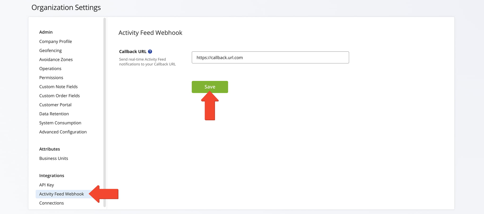 To set up webhooks, go to “Settings” > “Organization Settings” from the Navigation Menu, and select “Activity Feed Webhook” under “Integrations“. Input your webhook URL (postback URL) into the “Callback URL” field and click “Save” to finalize.