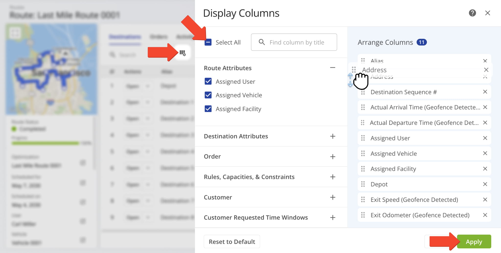 You can customize which columns appear in your Route Snapshot. Click the Display Columns Icon and check the boxes for the columns you want to show. To reorder columns, drag them to the desired position, then click “Apply” to save your changes.