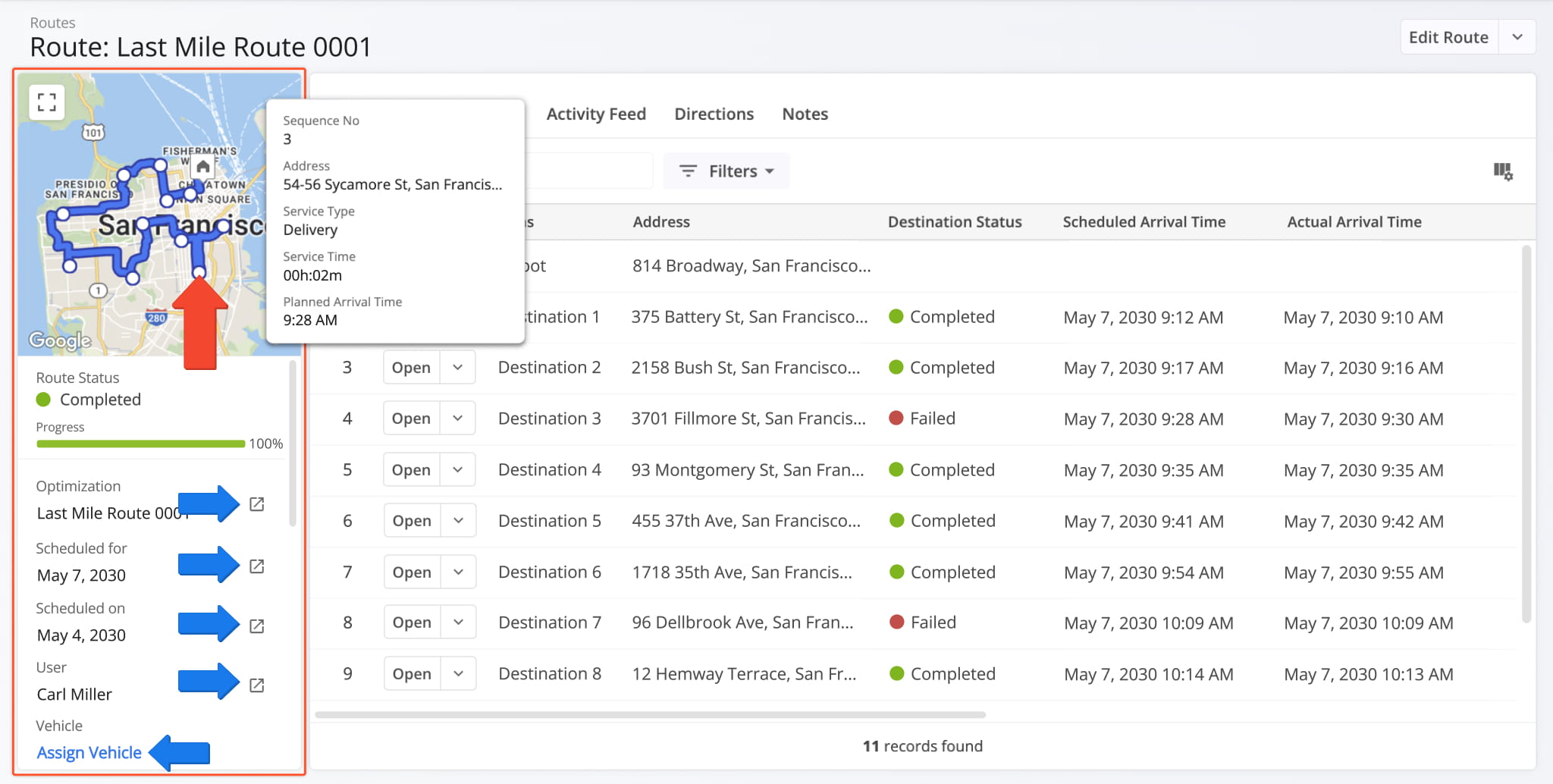 On the left, you can find the Route Summary. The map shows the route’s planned path, including the sequence of destinations. Hover your cursor over any destination to see a summary of its most relevant details.