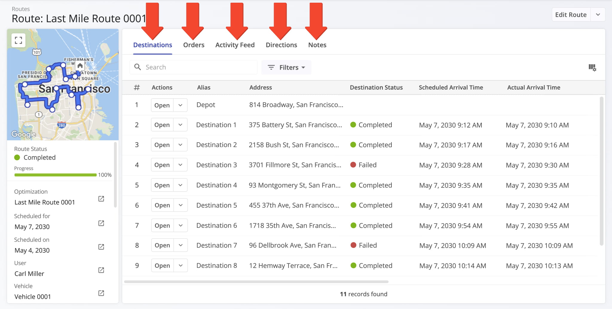 | Activity Feed | Chronological list of route activity events such as destination status updates, changes made in the Route Editor, and more. The available route activity entries on the Route Snapshot are the same as your regular Activity Feed. |