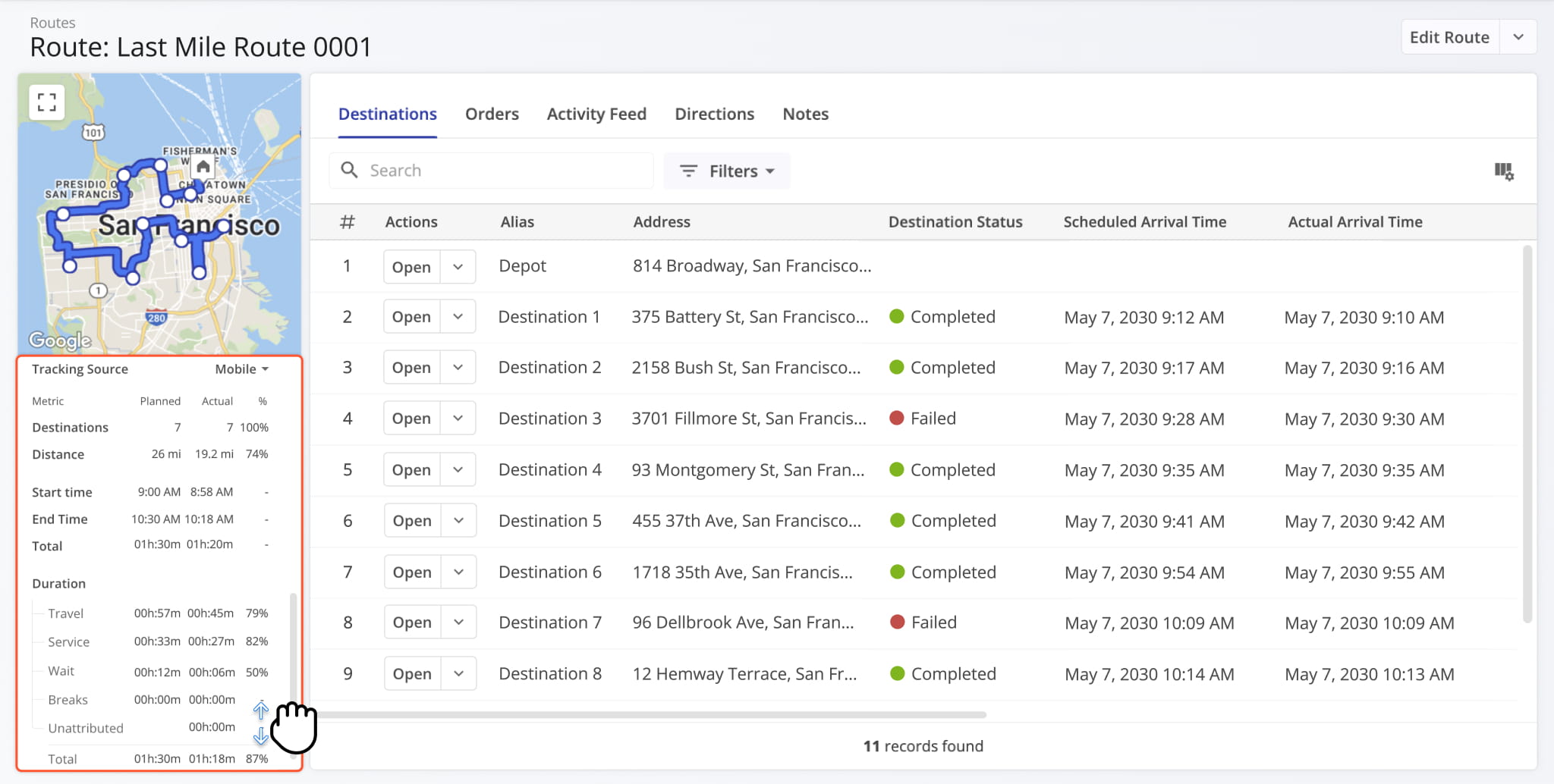 Scroll down in the Route Summary panel to see distance and duration data. Specifically, you can see planned metrics and their actual values after the route is completed or up to the last data sync for started routes, including the difference as a percentage.