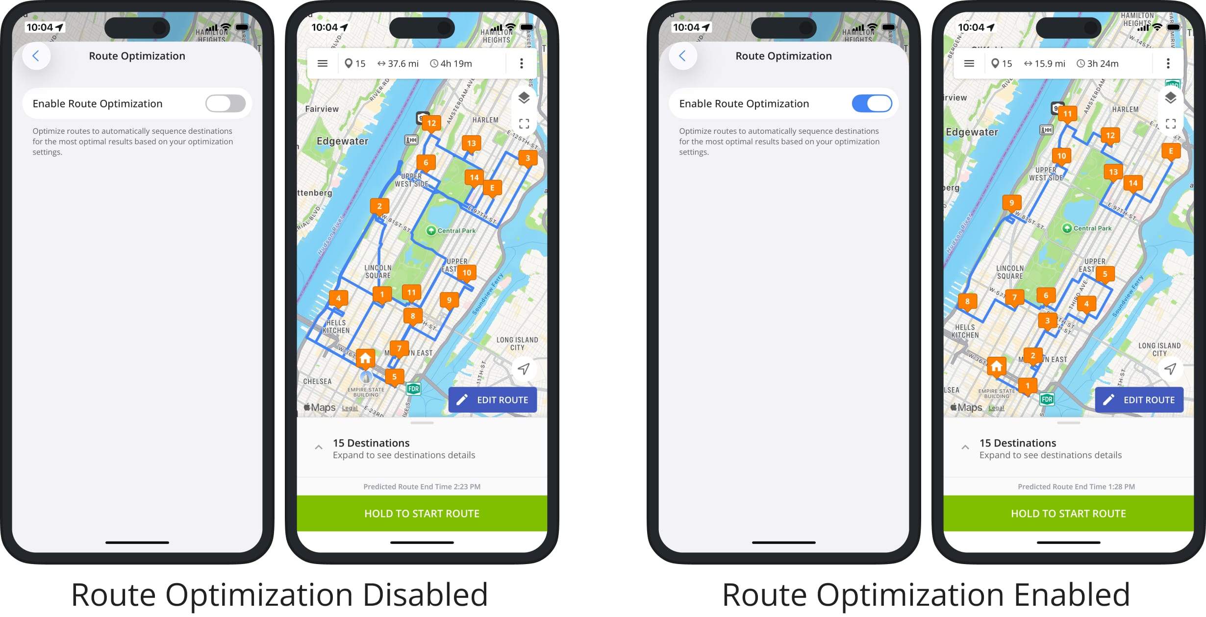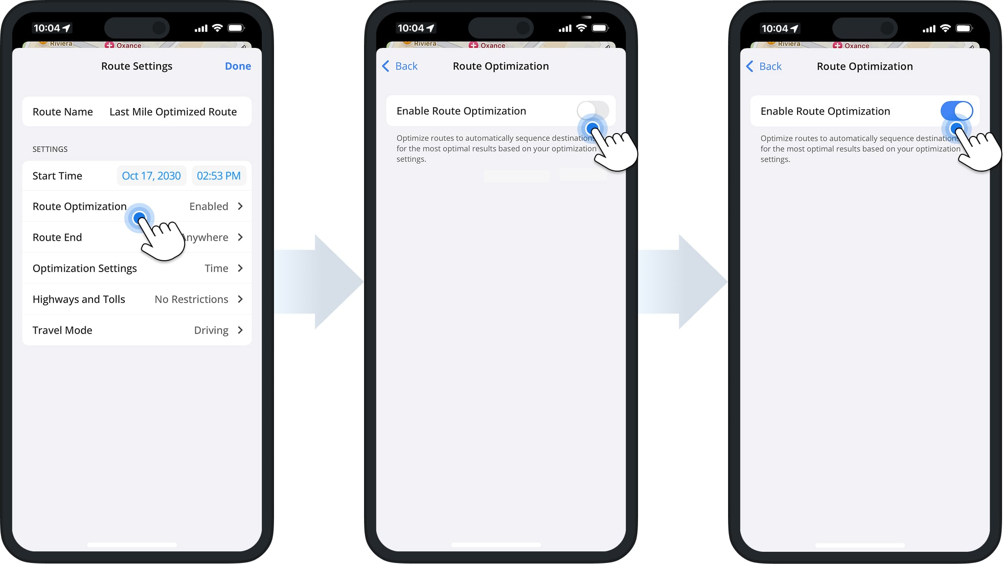 After naming and scheduling your route, you can enable or disable “Route Optimization“, which automatically sequences your addresses. To enable it, tap “Route Optimization” and switch on the “Enable Route Optimization” toggle.