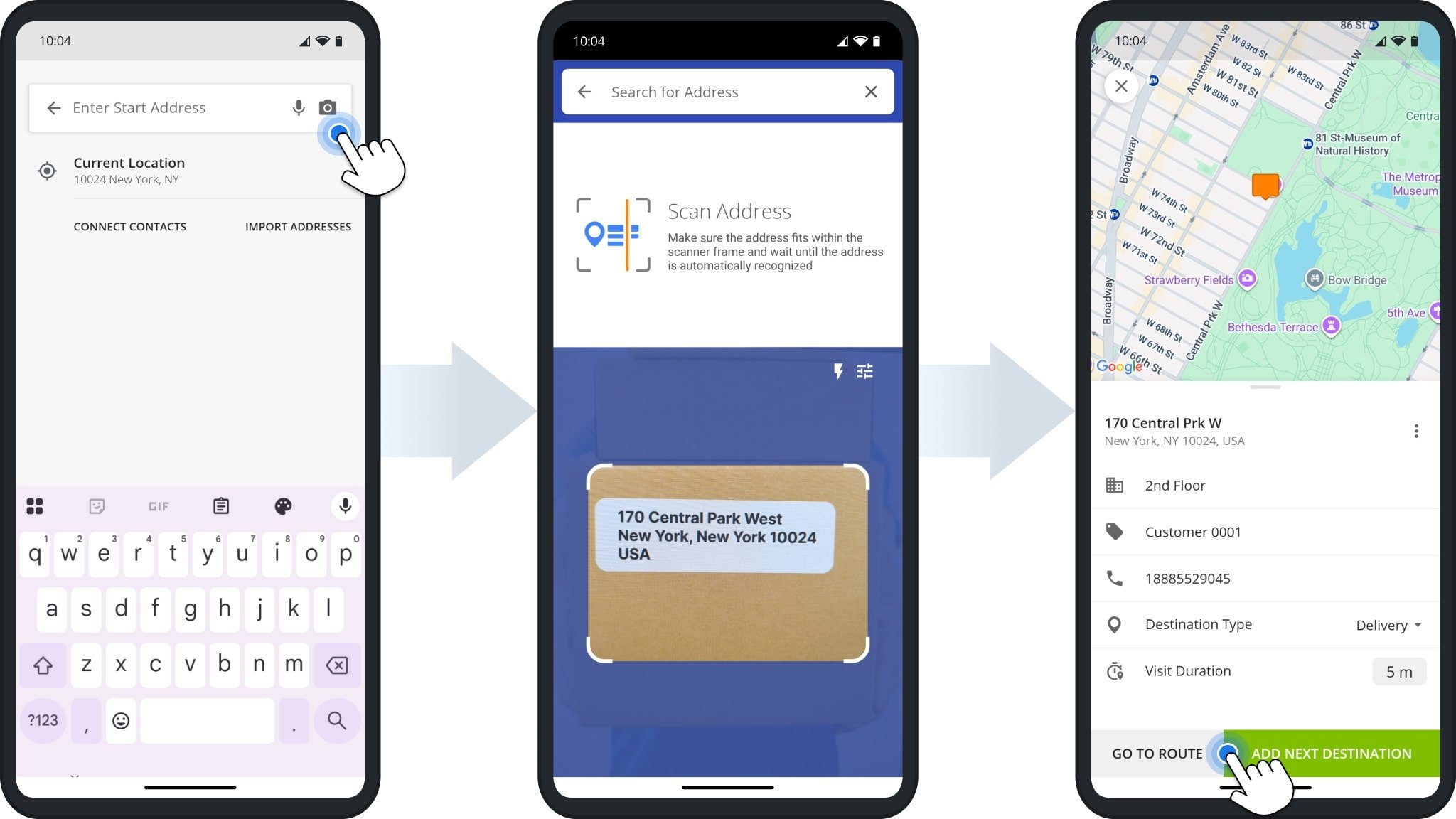 To quickly add addresses without typing, tap the Camera Icon in the “Search Here” field (iOS) or “Enter Address” field (Android). Point your camera at the address to capture it using Route4Me’s OCR Address Scanner.