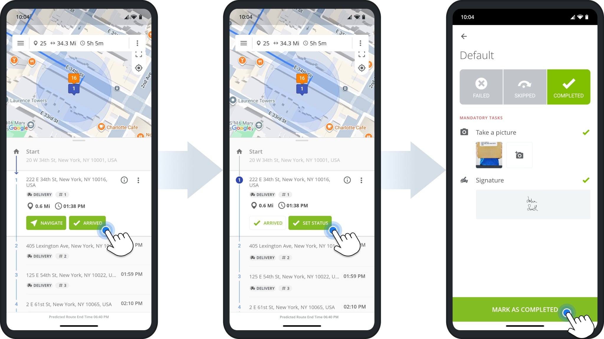 As you navigate your route and arrive at stops, you can update stop statuses and collect proof of visit, delivery, or service.