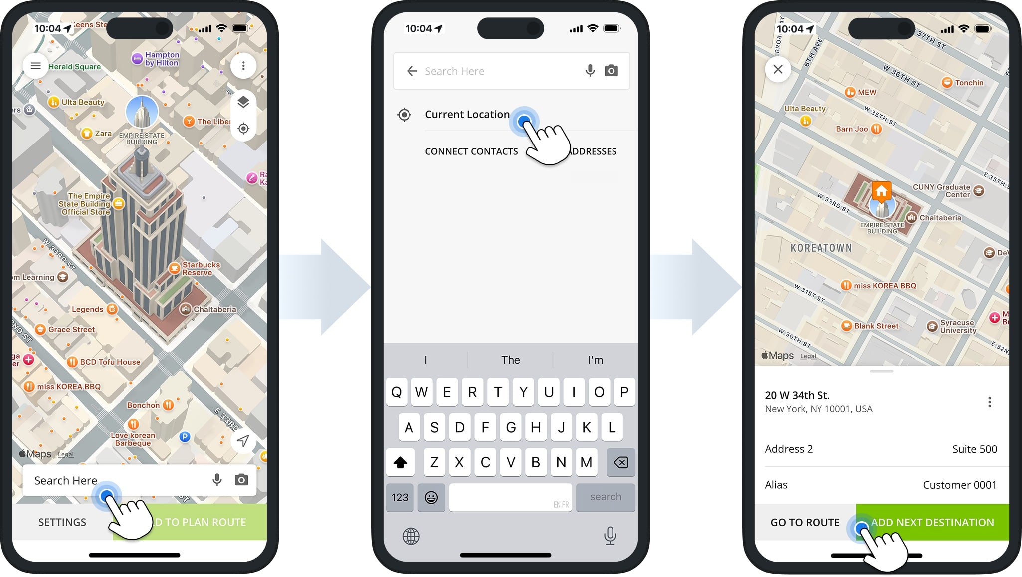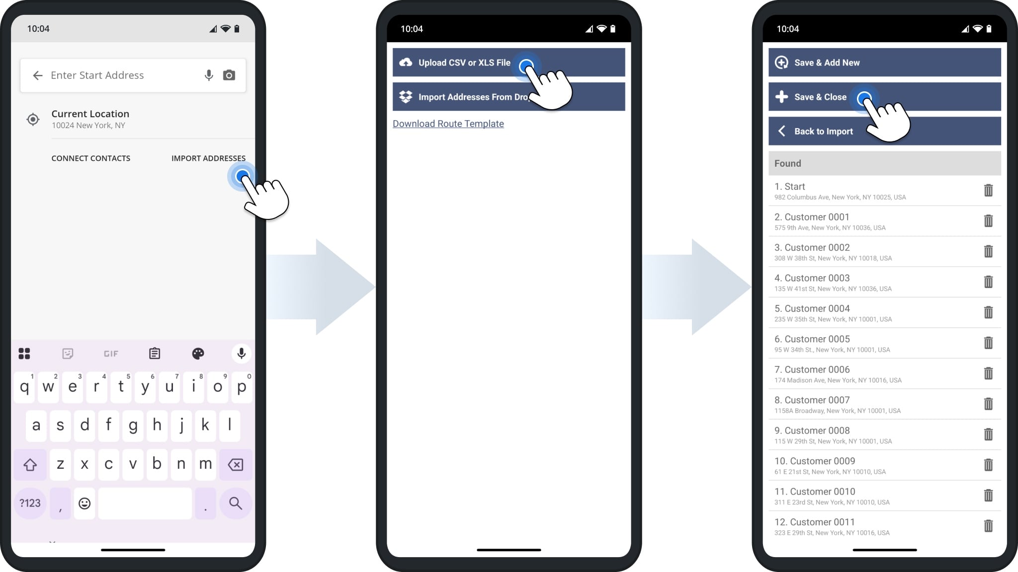 To quickly add multiple addresses, upload a CSV or XLS spreadsheets. Tap the “Search Here” field (iOS) or “Enter Address” field (Android). Then, select “Import Addresses” and choose a spreadsheet from your device, iCloud, Google Drive, or Dropbox.