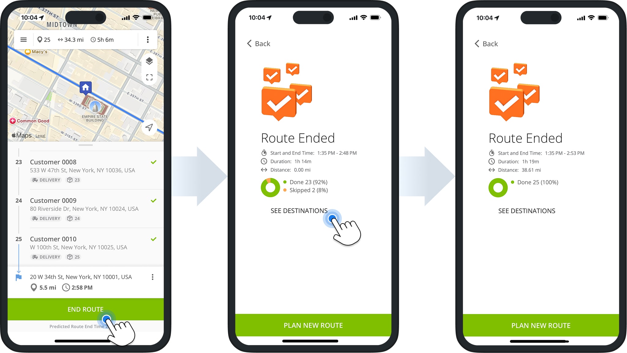 After you’ve visited all stops, Route4Me automatically prompts you to end the route. To finish, tap “End Route“. If any stops remain unvisited, tap “See Destinations” to open your stop list and update their statuses before ending the route.