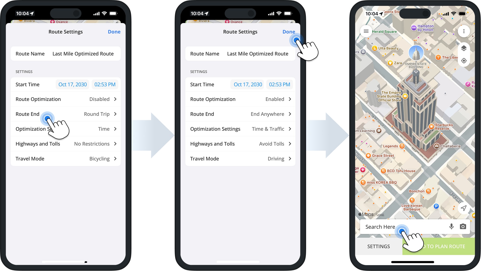 After enabling Route Optimization, select your preferred Route End option, Optimization Settings, Highway and Toll restrictions, and Travel Mode. When finished, tap “Done” in the top-right corner to proceed with adding addresses and stops.