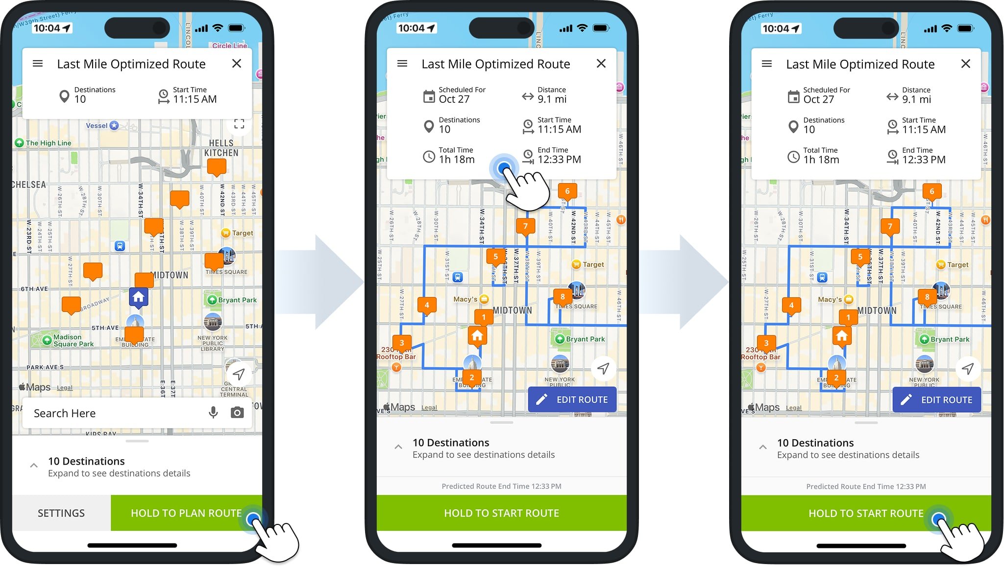 To start your route, tap and hold the “Start Route” button. Then, tap “Navigate” or the Navigate Icon next to the stop where you want to begin.
