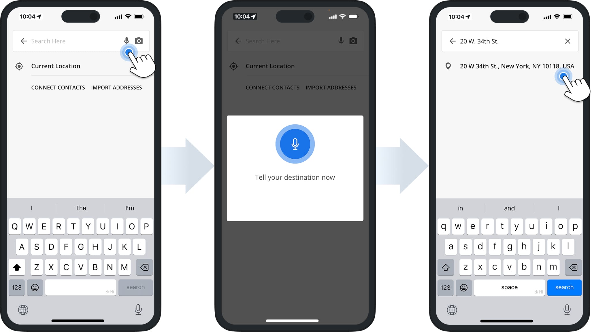 To add addresses using voice dictation, tap the Microphone Icon in the “Search Here” field. Then, dictate a full or partial address, and Route4Me will automatically suggest autocompleted and geocoded options.