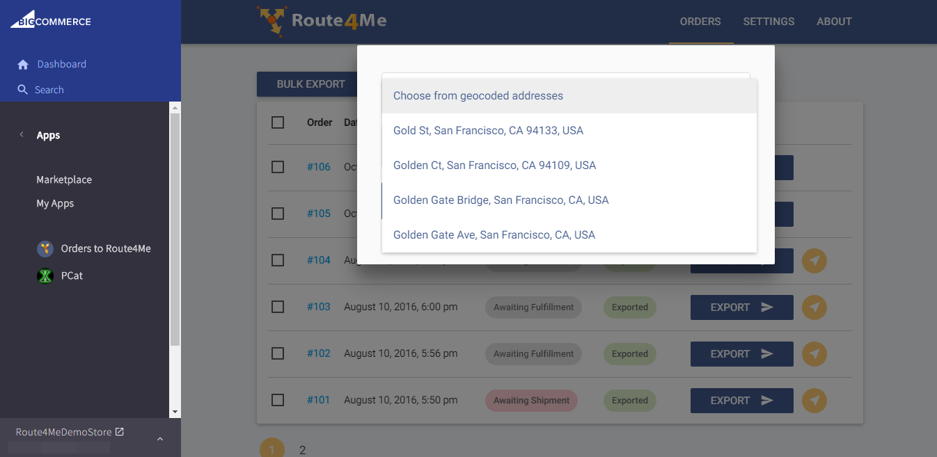 The Route4Me for BigCommerce plugin features a built-in geocoder, which allows you to accurately determine the correct address for each order.
