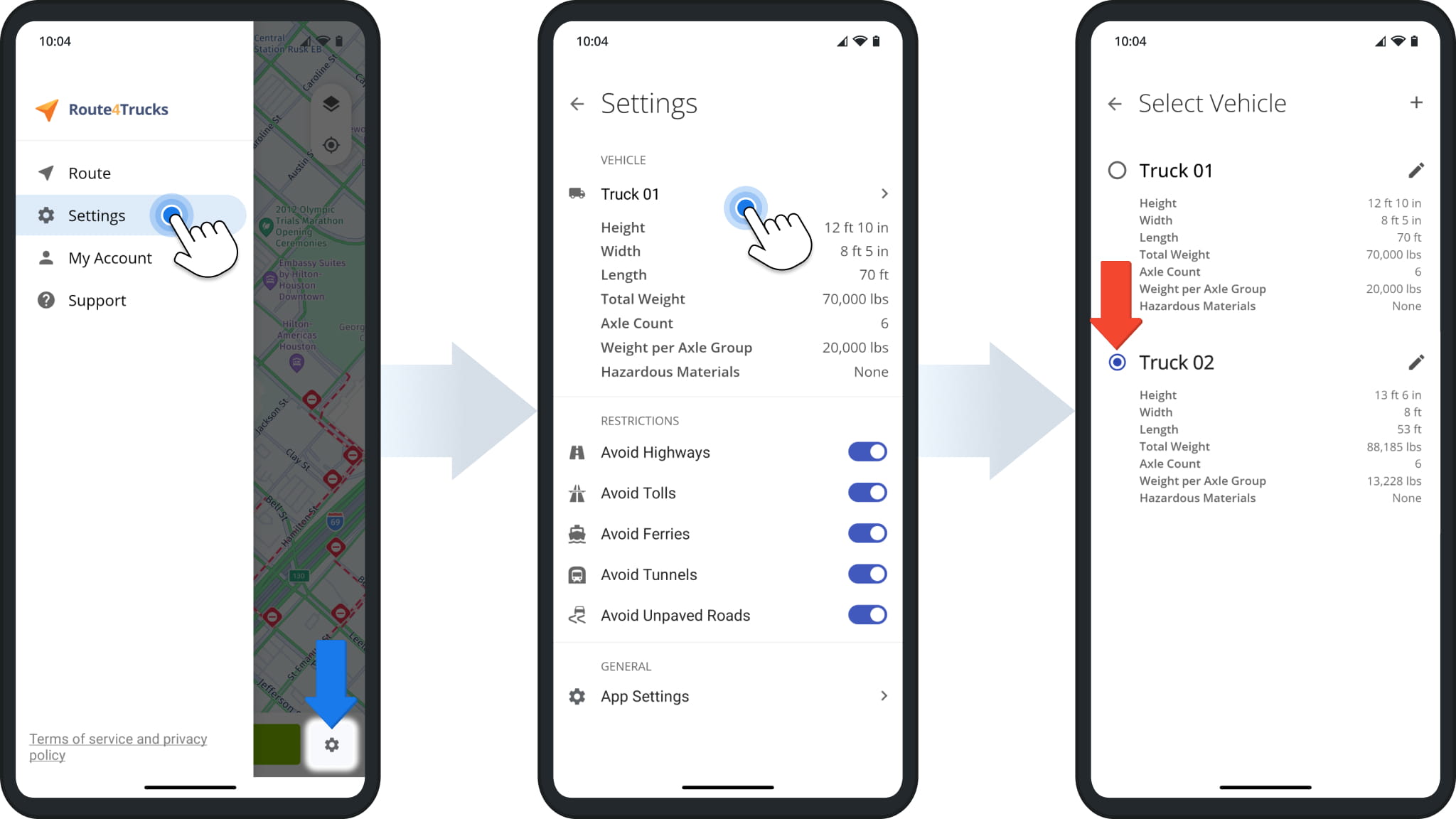 The Route4Trucks App Settings enable enterprise truck drivers to easily change the currently selected commercial vehicle.