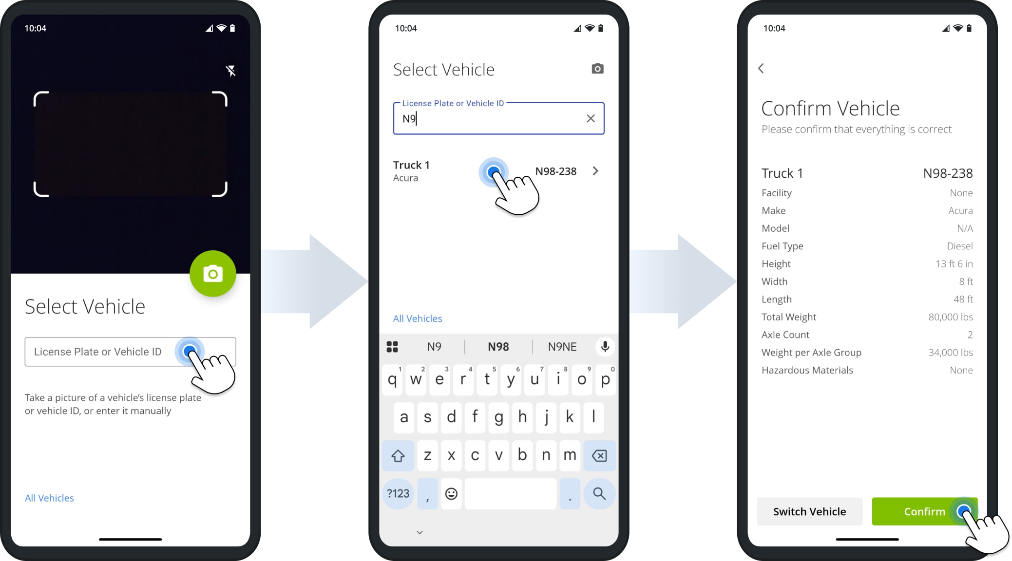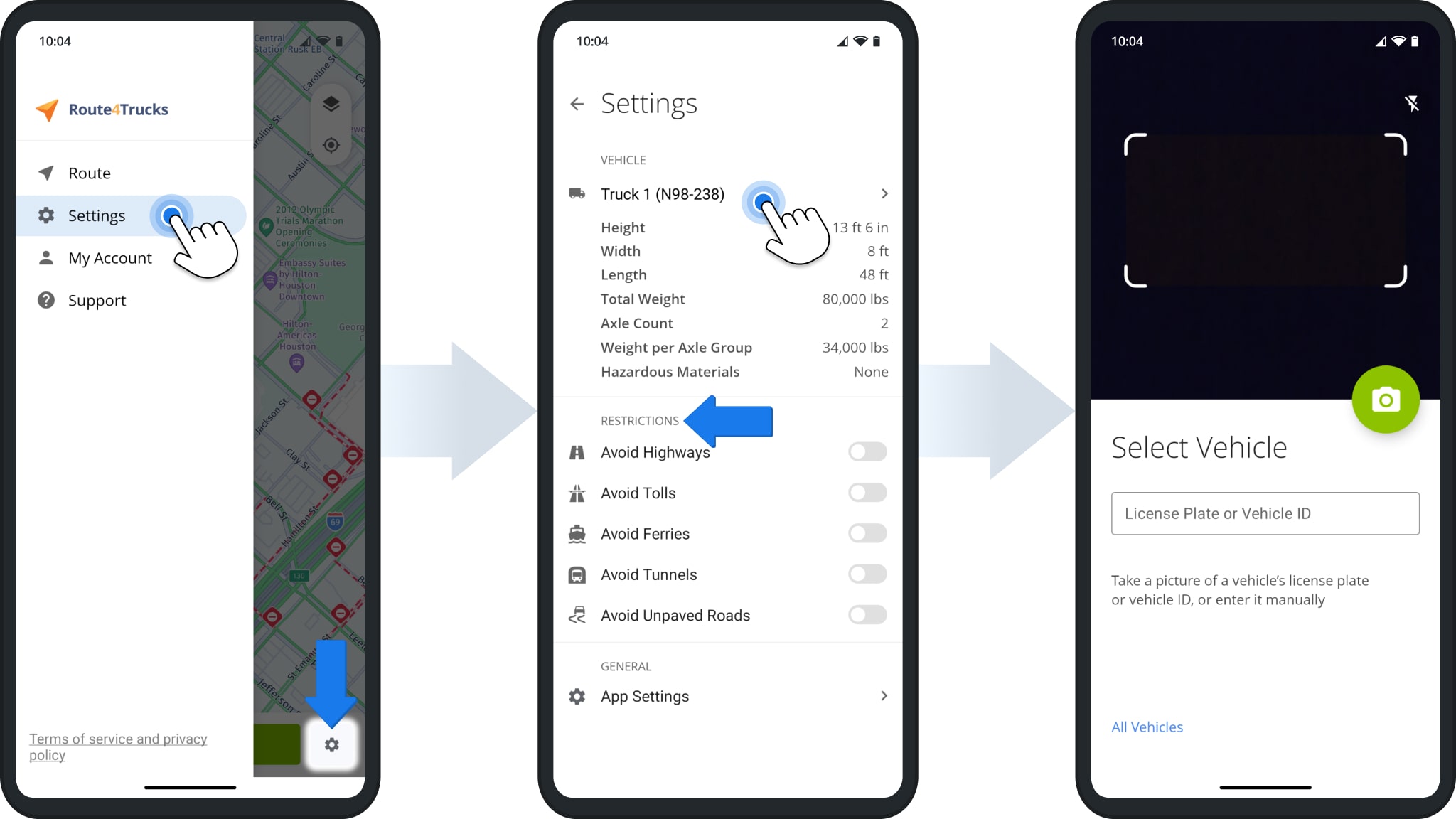 After the first time you open the app, Route4Trucks will automatically open the License Plate Scanner after signing in if there’s no selected vehicle. Simply point the camera at the truck’s license plate and tap the Camera Button to take a picture. Route4Trucks will automatically recognize the license plate and open the associated vehicle profile. If the vehicle details are correct, tap “Confirm” to proceed. You can also tap “Switch Vehicle” to scan or select a different truck.