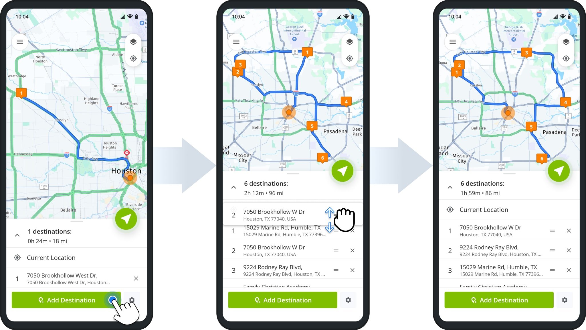 To plan a multi-stop truck route, add more destinations as described above. The route’s sequence will match the order in which you added the destinations. At any time, you can tap and drag a destination to change its position in the route sequence.