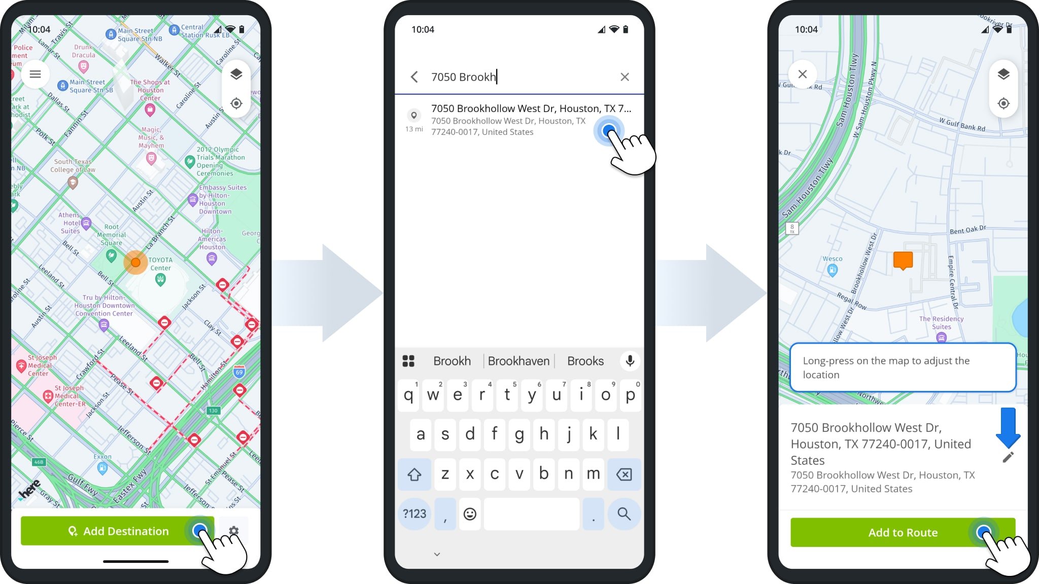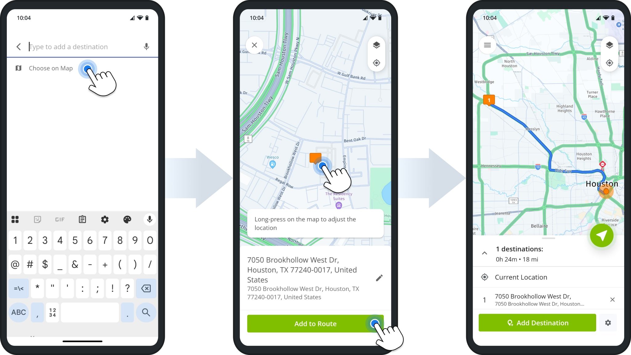 Alternatively, instead of typing an address, you can tap “Choose on Map” and tap and hold an address on the map to select it as a destination. Tap “Add to Route” to add the selected address as a destination on the route.