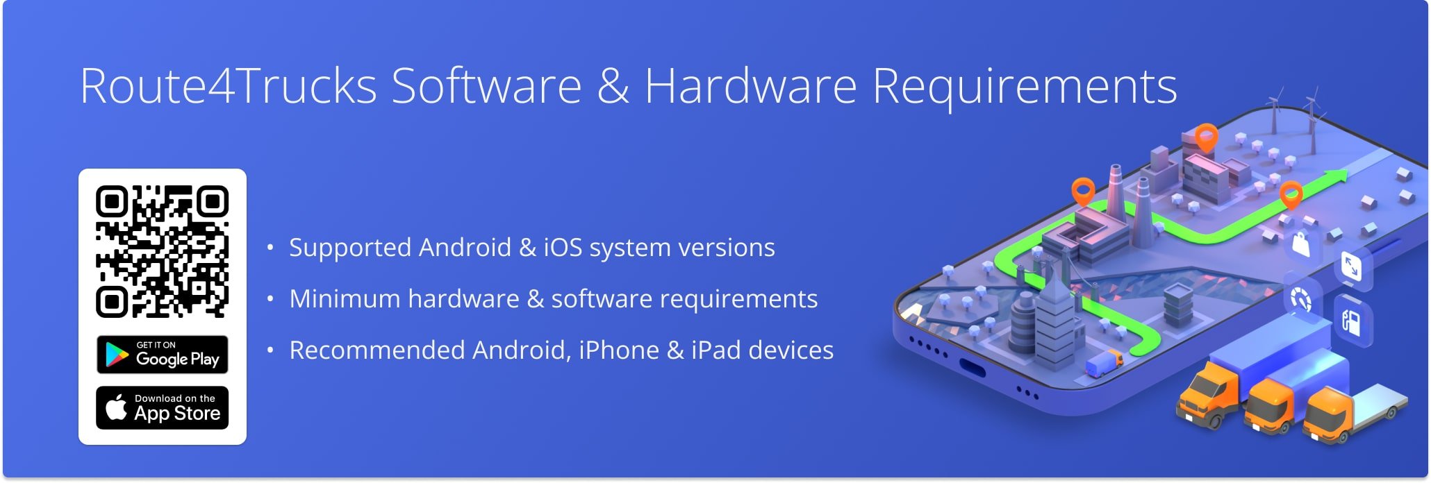 In this guide, you’ll find the minimum and recommended software and hardware truck app requirements for using the Route4Trucks Android Truck App and iPhone Truck Driver App. To make sure you can easily navigate commercial vehicle-compliant routes, Route4Trucks is supported on most Apple devices (iPhones and iPads) and most Android devices. Below, you can find the minimum and recommended Route4Trucks software and hardware requirements.