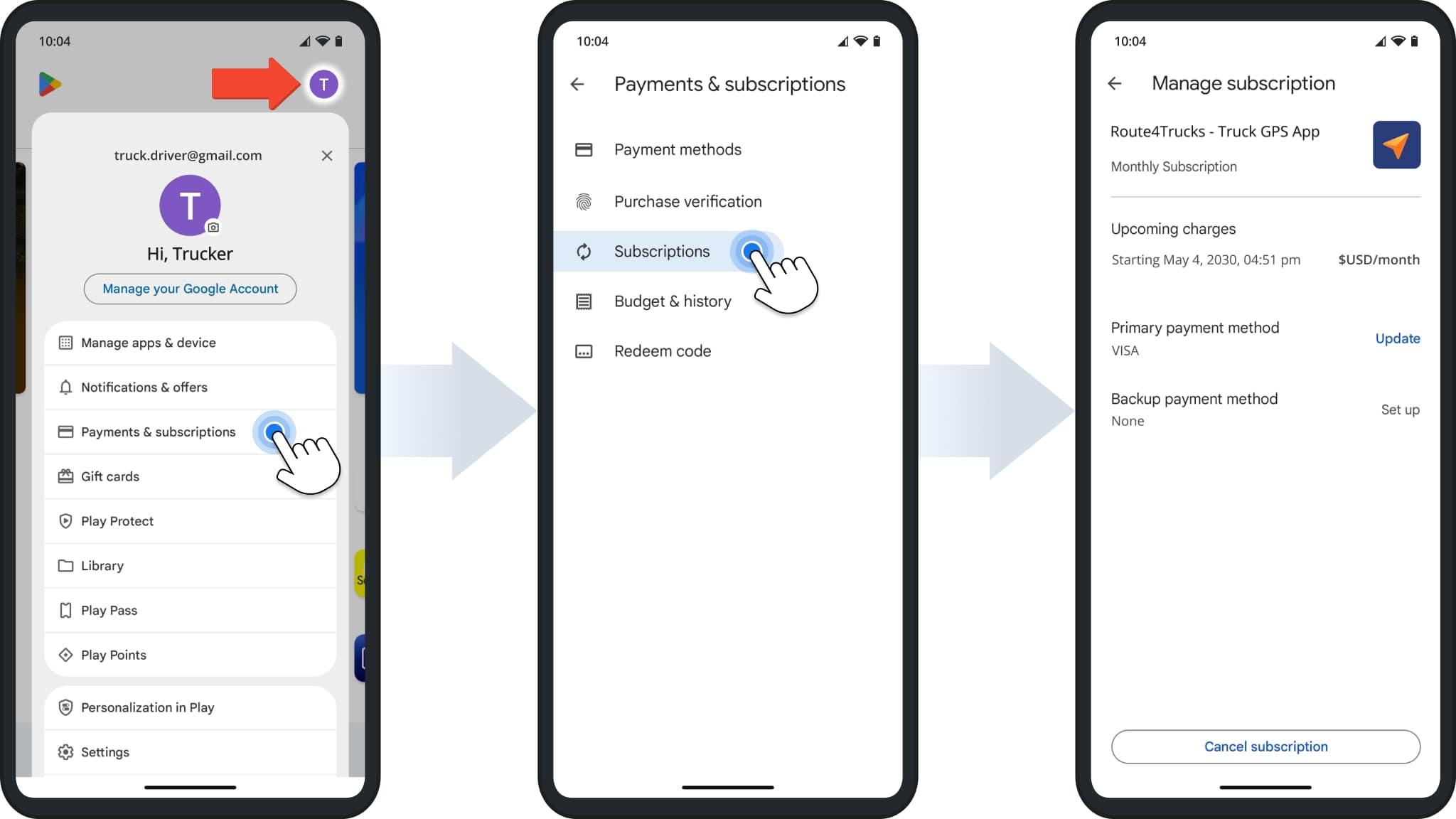 NOTE: Your subscription is billed and managed by Google. Learn more about Subscriptions Management on Google Play Help. Route4Me can’t change or cancel your Route4Trucks subscription or restore your Google account password.