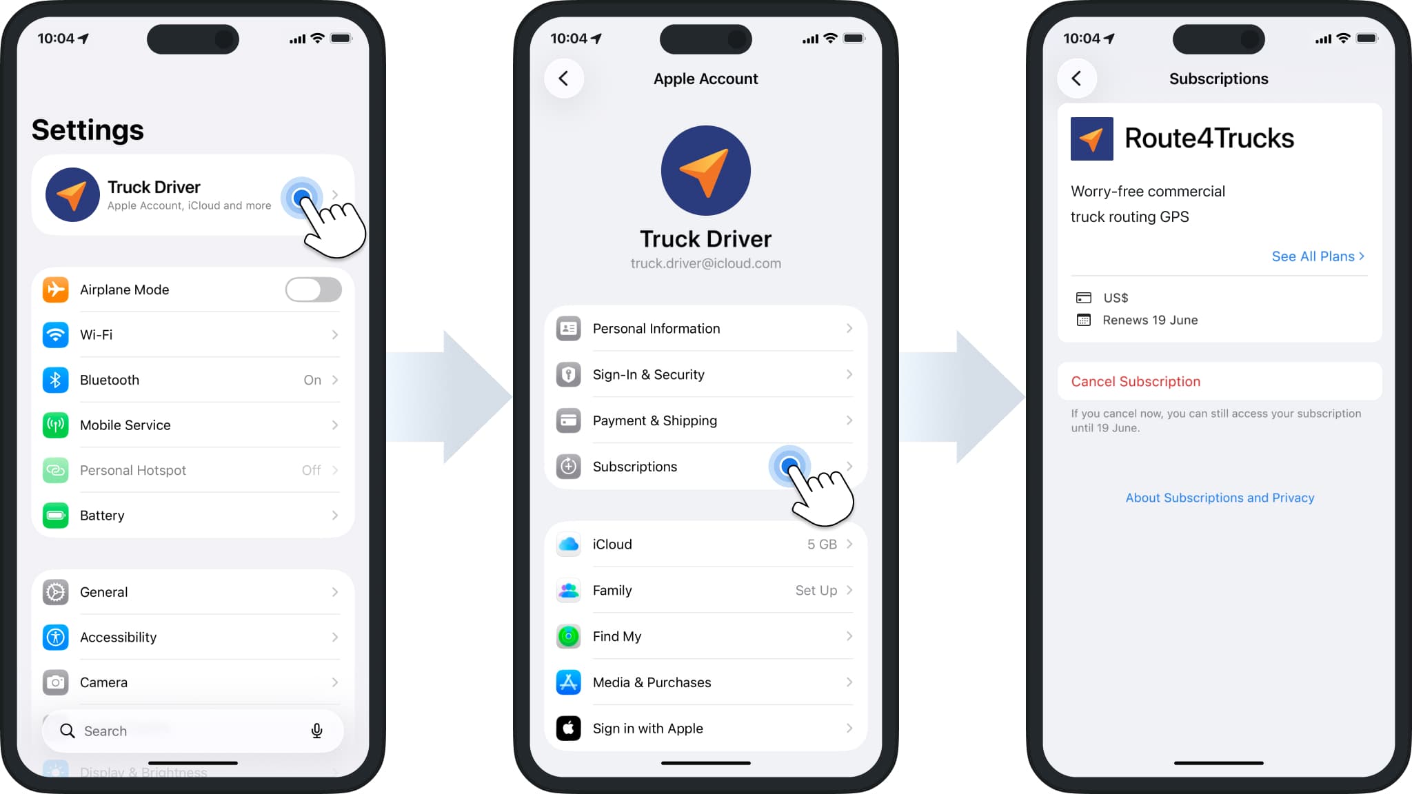 NOTE: Your subscription is billed and managed by Apple. Learn more about Subscription Management on Apple Support. Route4Me can’t change or cancel your Route4Trucks subscription or restore your Apple account password.