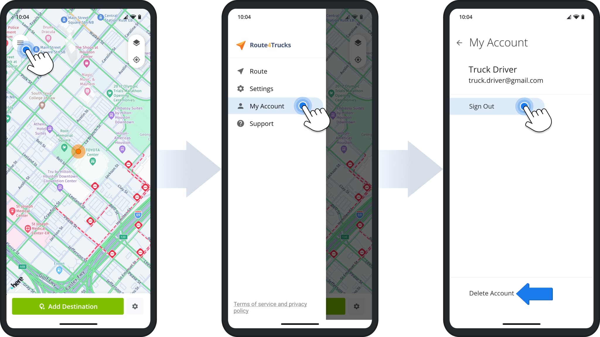 To open and manage your Route4Trucks account, tap the Menu Button in the top-left and go to “My Account” from the menu. Next, you can check your account details, sign out of your account, or delete your account.